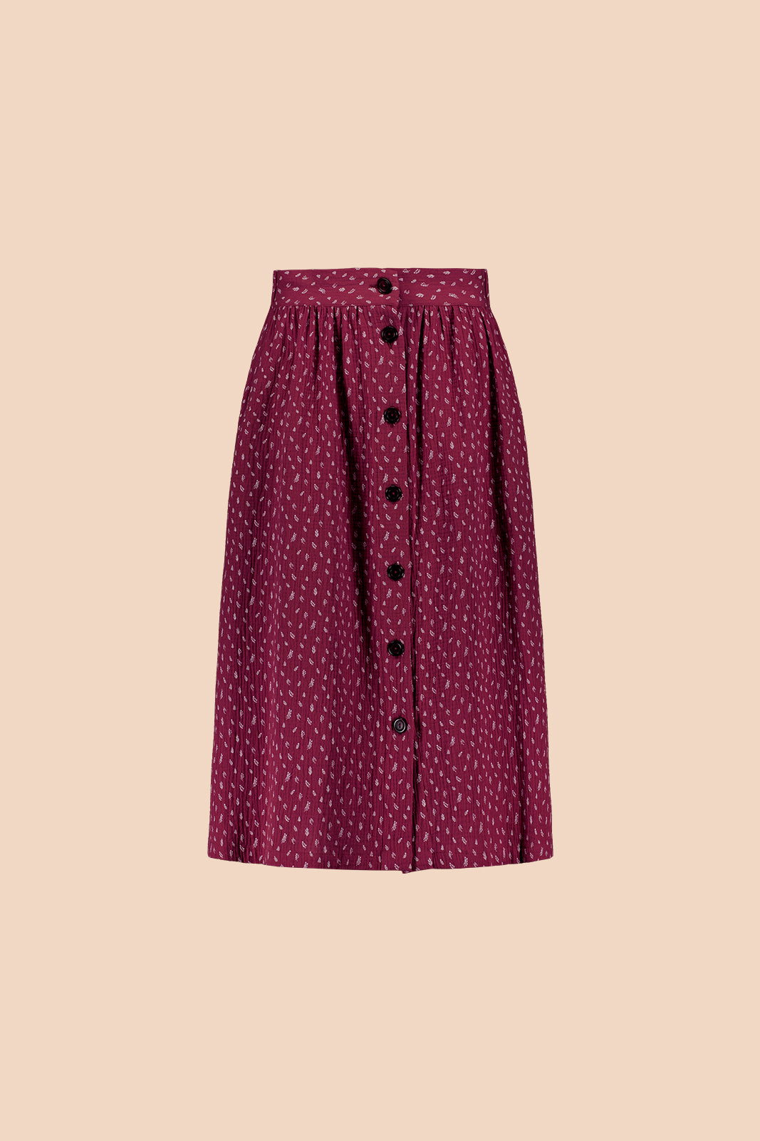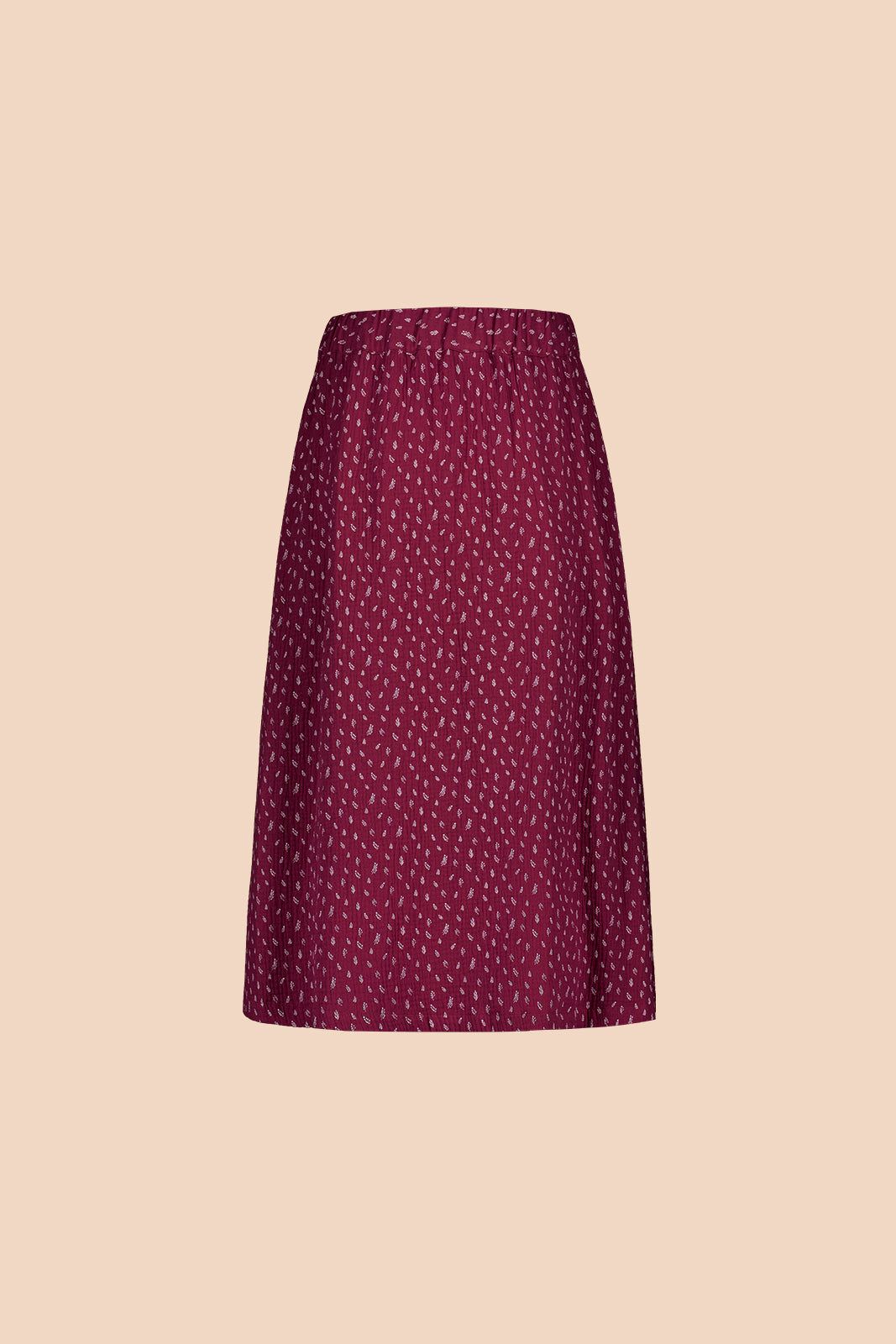 Laadukkaassa midimittaisessa hameessa on kauniisti laskeutuva siluetti ja keskietua koristaa avattava nappirivi. Takana vyötäröllä oleva kuminauha lisää käyttömukavuutta ja tekee hameesta miellyttävän päällä. Kuosina Vintage Leaf Burgundy.