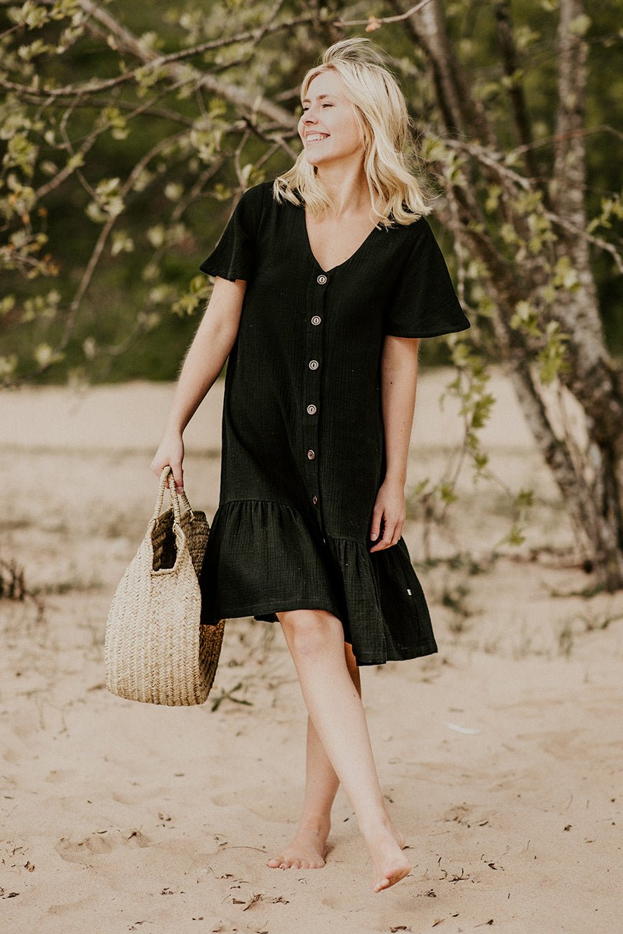Mukava ja rento naisten mekko Frill Button Dress on valmistettu luomupuuvillamusliinista. Materiaalin valloittavan pehmeä ja eläväpintainen tekstuuri tekee mekosta erityisen mukavan päällä.