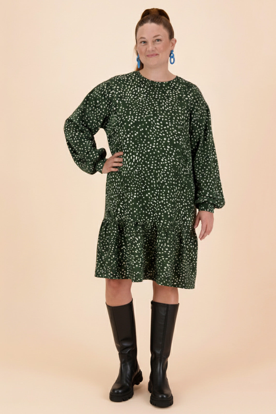 Tämä vastuullisesti valmistettu collegemekko ihastuttaa rennolla oversize-istuvuudellaan ja leikkisällä frillahelmadetaljillaan. Pehmeässä mekossa on lyhyehkö helman pituus, laskettu olkalinja ja täyspitkät hihat. Kuosina minimalistinen Wild Dots Moss, jossa hiekan sävyiset pilkut aaltoilevat tummanvihreällä pohjalla.