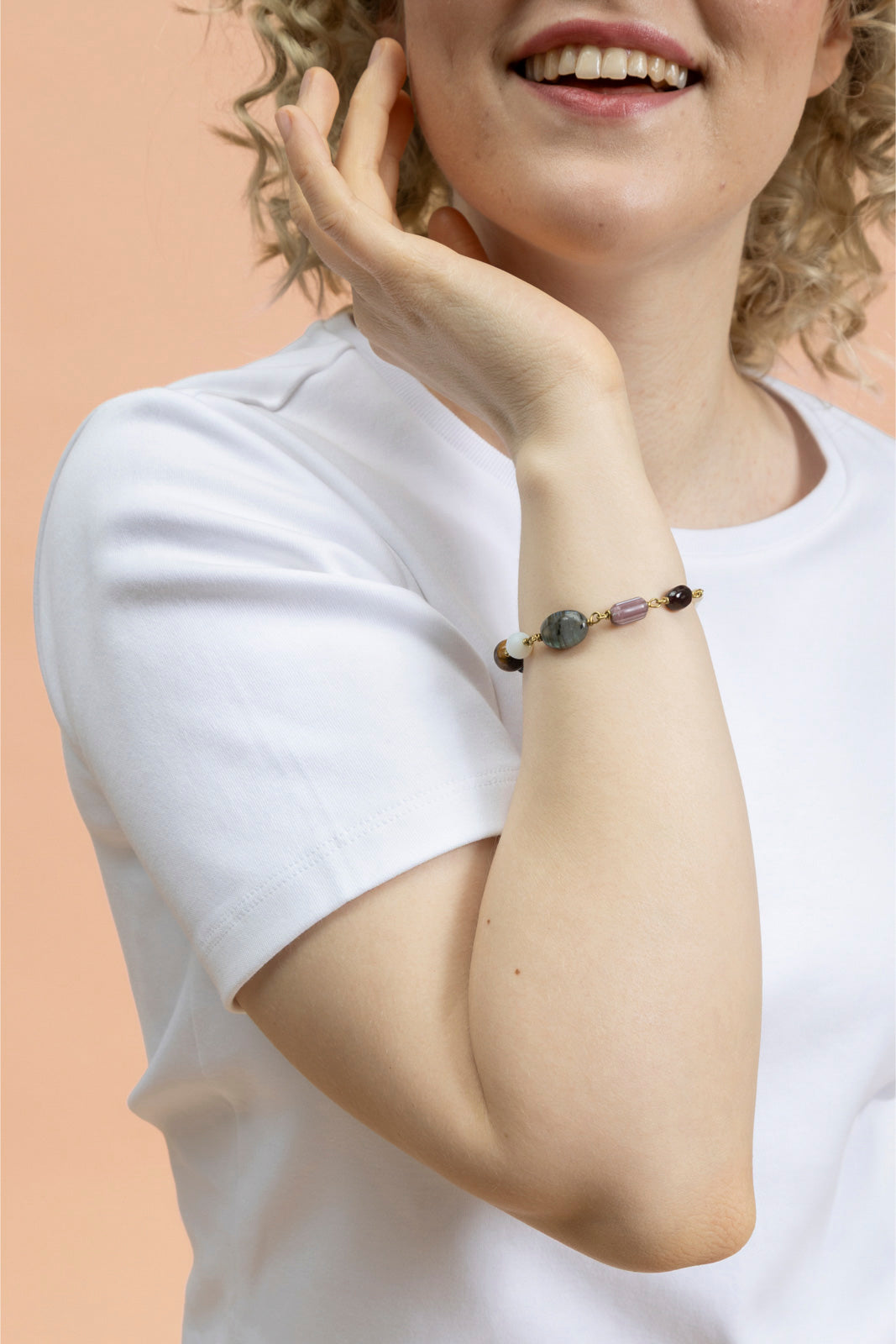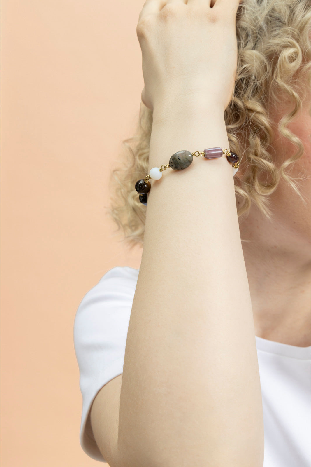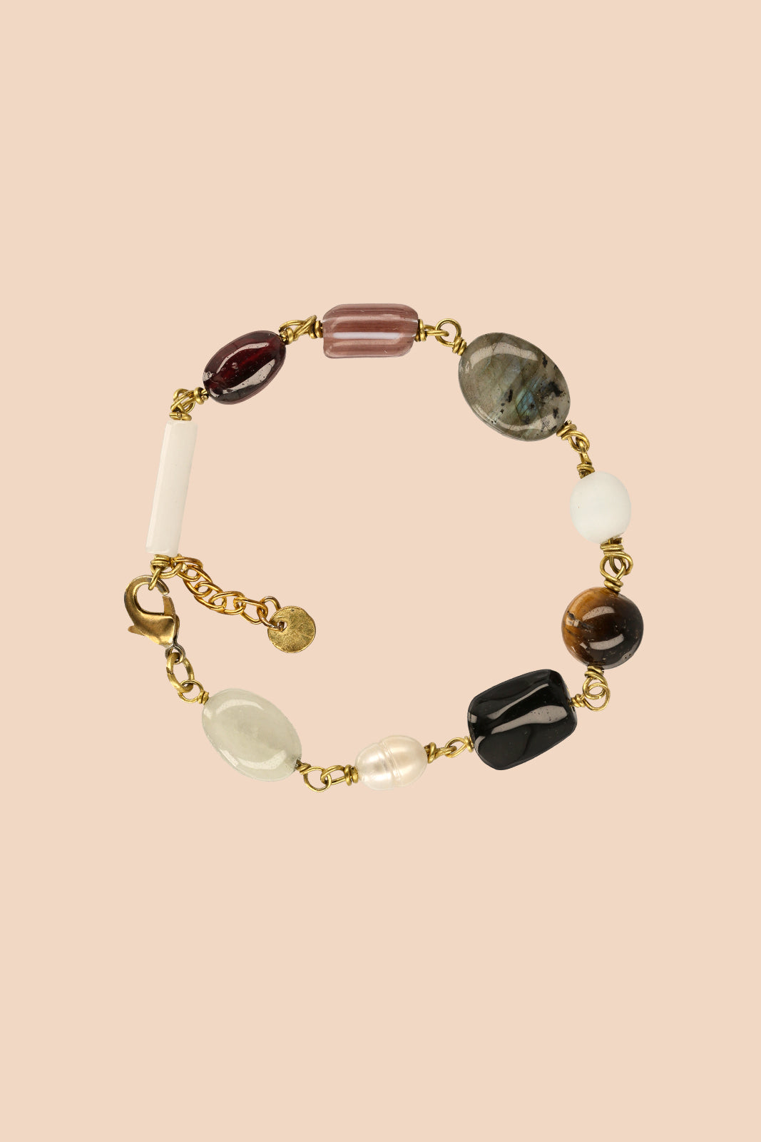 Runsas yhdistelmä luonnon kiviä ja tekstuureja. Tässä naisten rannekorussa yhdistyvät granaatti, labradoriitti, aventuriini, helmet ja lasihelmet kauniissa luonnollisissa sävyissä – näyttävä mutta helposti yhdisteltävä koru arkeen ja juhlaan.