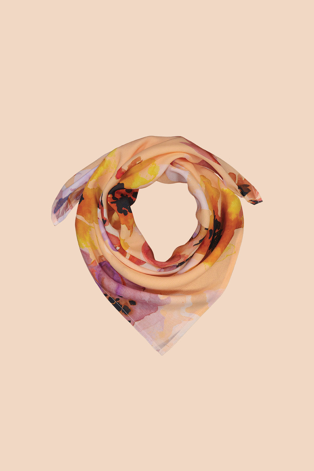 Viimeistele asusi monikäyttöisellä Square Scarf -huivilla: kietaise kaulan ympärille, hiuksiin, päähän tai solmi laukun koristeeksi. Kuosina Peach Anemone, jossa suuret vesivärikukat rönsyilevät persikkaisella pohjalla.