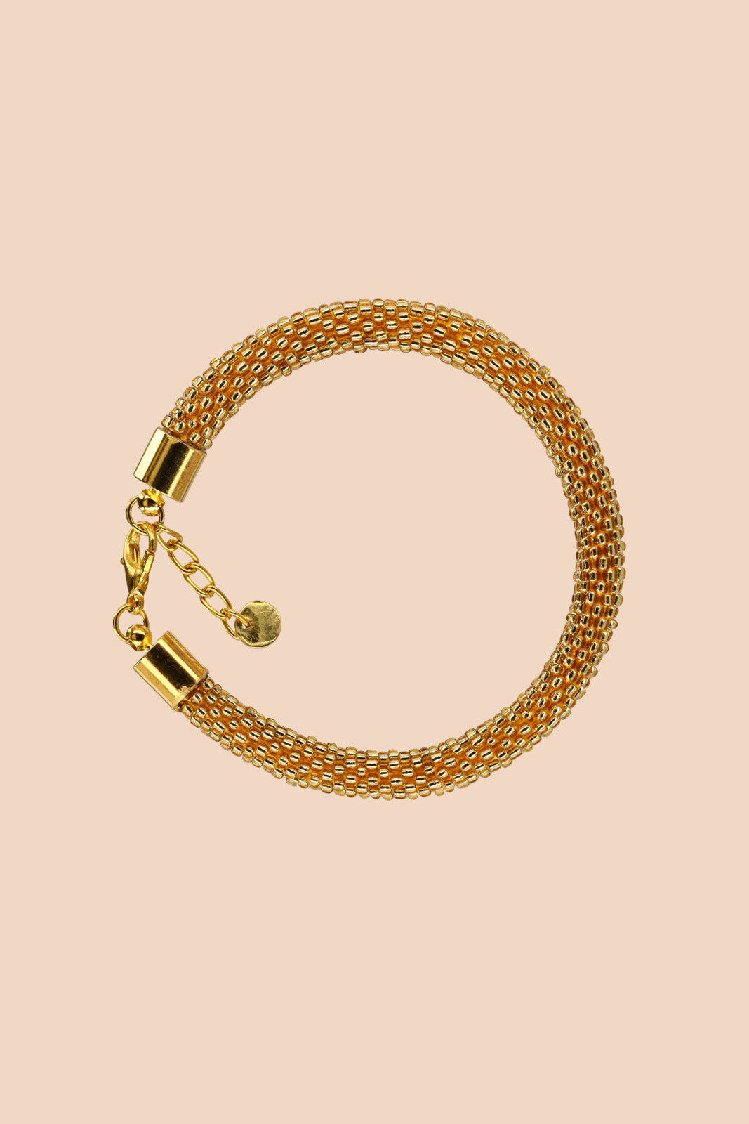 Näyttävä ja tekstuuriltaan rikas naisten rannekoru kullanhohtoisessa sävyssä. Valmistettu lasihelmistä ja messingistä samalla tekniikalla kuin myydyimmät Gia-korvakorumme.