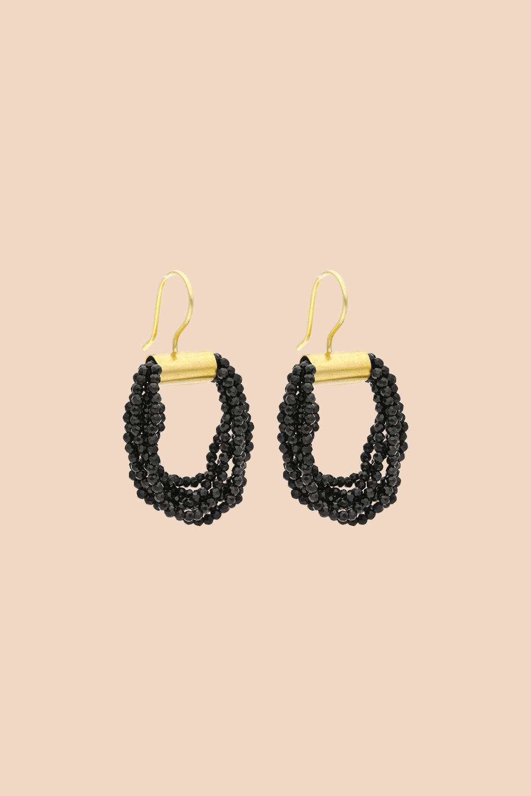 Kaikon tyylikkäät Kaneila -korvakorut on valmistettu käsityönä Nepalissa. Korun katseenvangitsijana toimivat mustat kristallihelmet. Korvakorujen kiinnikkeet ovat messinkiä ja nikkelivapaita, mutta ne voivat ärsyttää erittäin herkkää ihoa. Korun kokonaismitta on 4,5 cm.