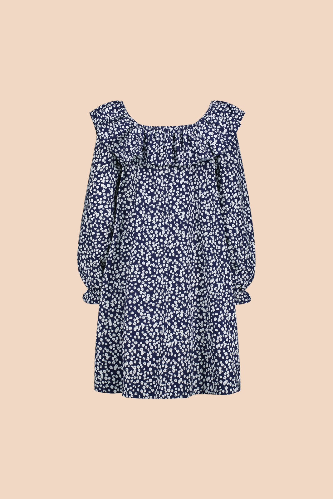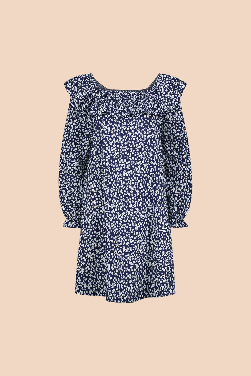 Väljässä A-linjaisessa mekossa on neliönmuotoinen pääntie, jota kiertää frilla. Pääntie on poimutettu kuminauhalla, joten mekkoa voi käyttää myös off-shoulder-tyylisesti. Mekossa on täyspitkät hihat, ja hihansuissa on pienet frillat. Hihat voi halutessaan vetää kyynärvarteen oman tyylin ja käyttömukavuuden mukaan. Runsas A-linjainen helma tuo mekkoon ilmavuutta, ja sivusaumoissa on käytännölliset taskut. Kuosina tummansinipohjainen Flora Navy.