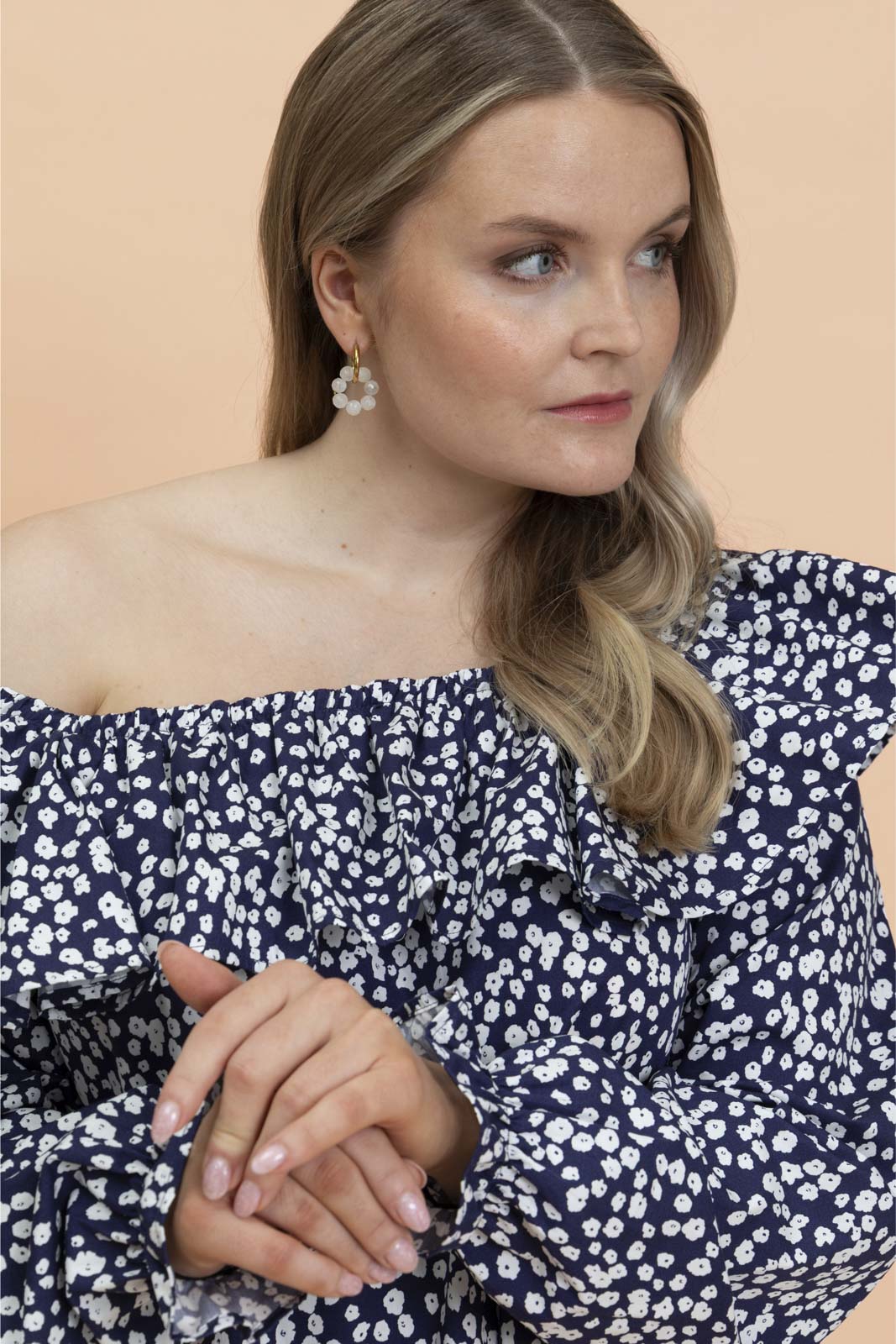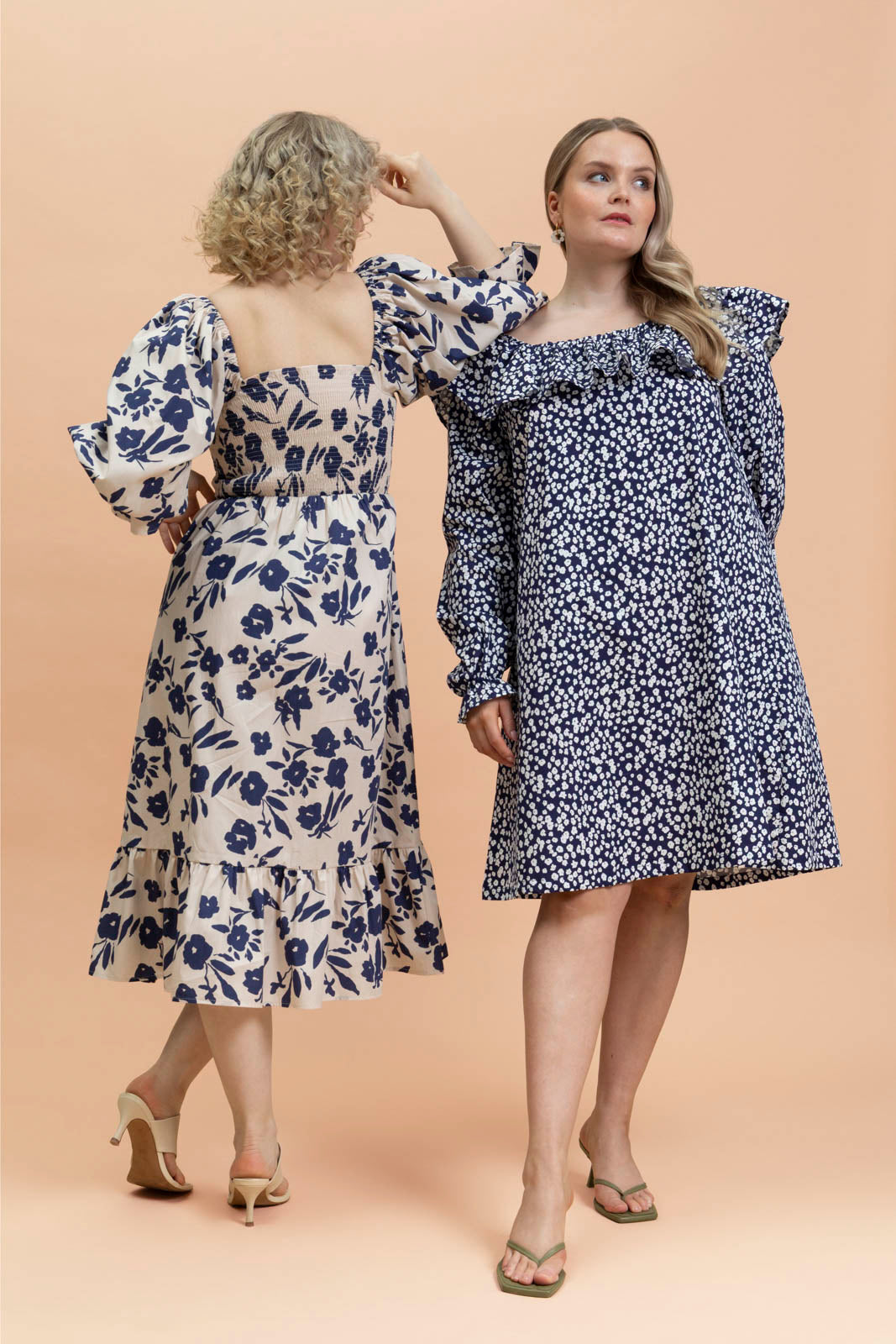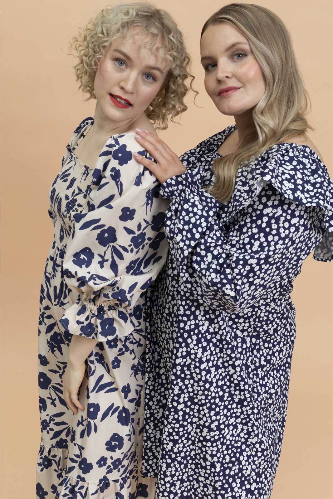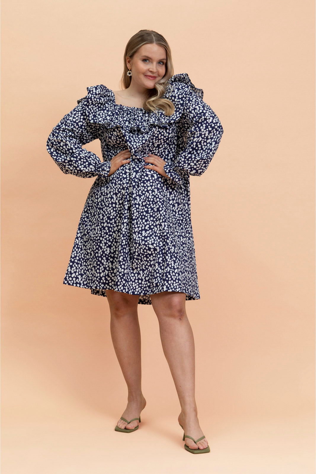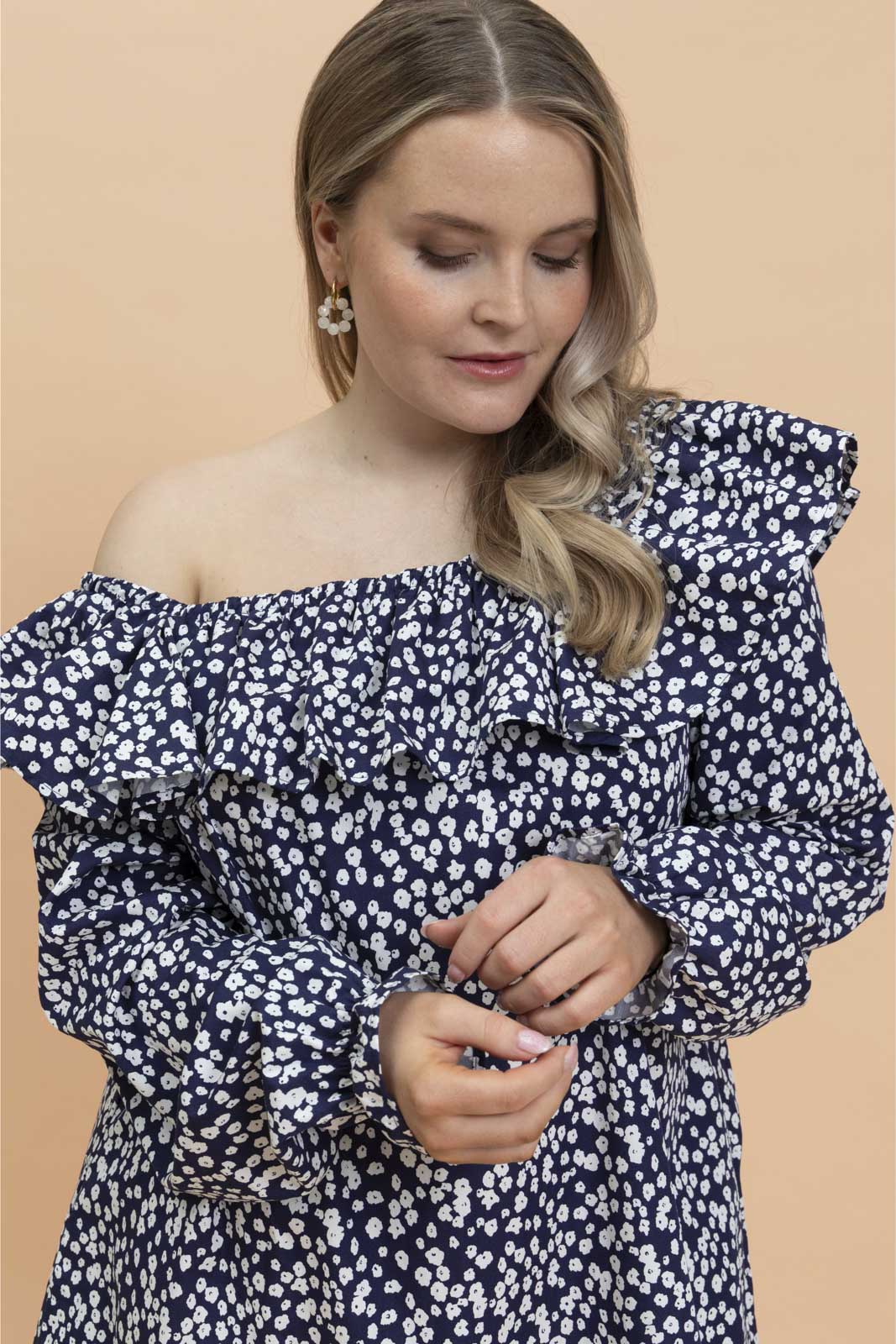 Väljässä A-linjaisessa mekossa on neliönmuotoinen pääntie, jota kiertää näyttävä frilla. Pääntie on poimutettu kuminauhalla, joten mekkoa voi käyttää myös off-shoulder-tyylisesti. Mekossa on täyspitkät hihat, ja hihansuissa on pienet frillat. Hihat voi halutessaan vetää kyynärvarteen oman tyylin ja käyttömukavuuden mukaan. Runsas A-linjainen helma tuo mekkoon ilmavuutta, ja sivusaumoissa on käytännölliset taskut. Kuosina tummansinipohjainen Flora Navy.