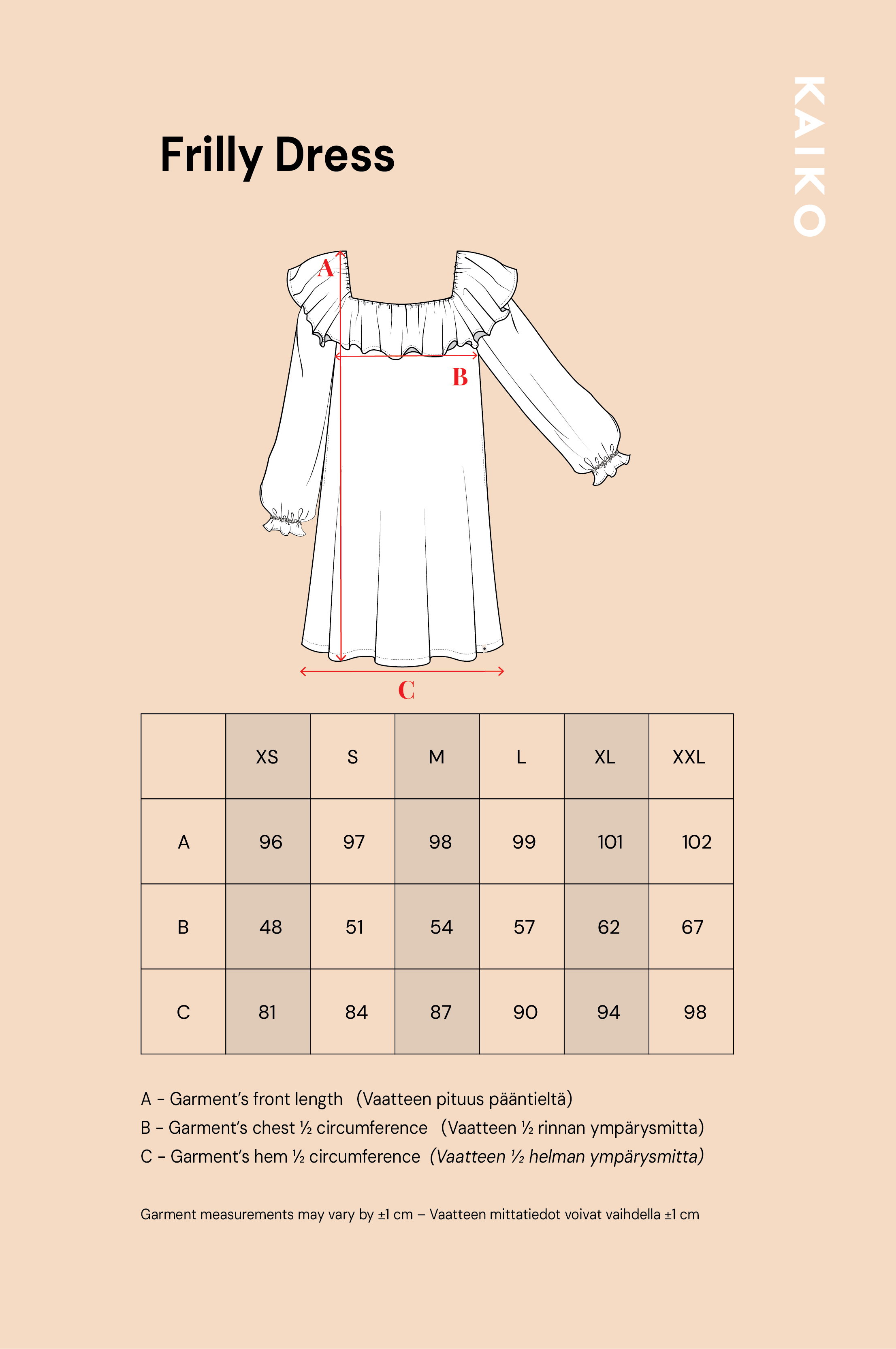 Frilly Dress on helppo stailata eri tilanteisiin ja sesonkeihin. Käytä lämpimämpinä päivinä paljaiden säärien kanssa tai kerrosta viileämmällä säällä. Tämä näyttävä ja monikäyttöinen mekko on suunniteltu palvelemaan vaatekaapissasi vuodesta toiseen.