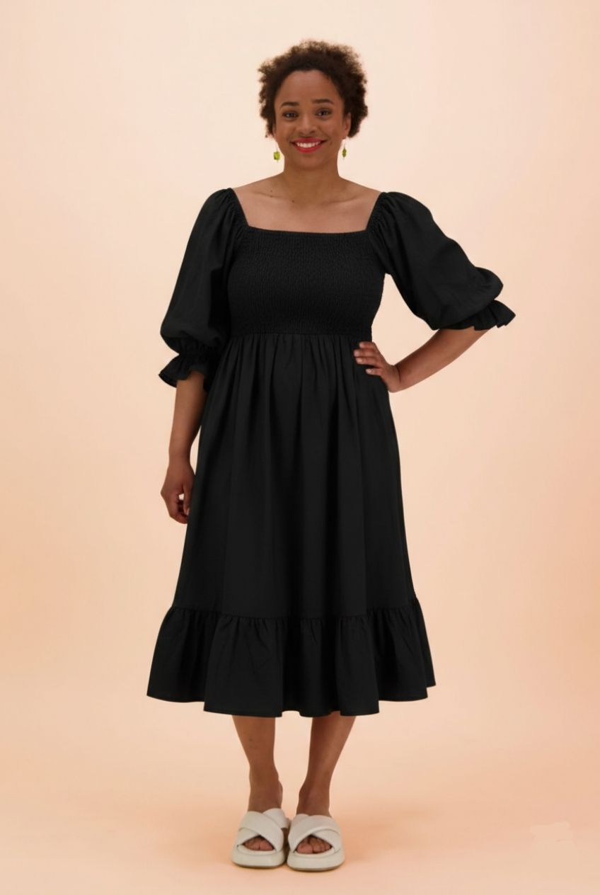 Näyttävä Smock Dress on valmistettu luomupuuvillapopliinista. Mekossa on nelikulmainen pääntie ja istuva smokkirypytetty yläosa. Suurissa puhvihihoissa on olalla kuminauhat, jotka pitävät hihat hyvin paikoillaan. Hihat saa halutessaan vedettyä myös olalta alas off-shoulder-tyyliin. Vajaamittaisten hihojen suissa on frilla yksityiskohdat, jotka on poimutettu kuminauhalla. Midimittaista levenevää helmaa koristaa frilla. Sävynä klassinen musta.