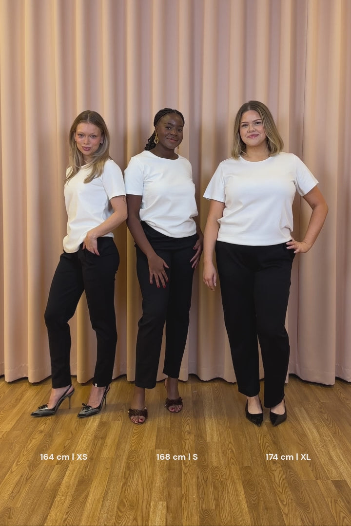 Kun haluat siistit housut, jotka eivät tingi mukavuudesta ovat Comfy Slacks -housut varma valinta. Napakasta ja joustavasta ponte roma -interlock-neuloksesta valmistetut housut mukailevat suorien housujen henkeä, mutta tuntuvat päällä ihanan pehmeiltä. Housuissa on leveä joustava vyötärö (5 cm korkea) ja edessä on taskut. Takana muotolaskokset, jotka takaavat hyvän istuvuuden. Sivusaumoissa kulkee denim-tikkaus, joka luo housuihin ekstraskarppia fiilistä. Värinä klassinen musta.