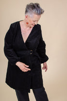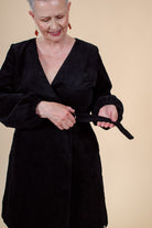 Mekossa on naisellinen kietaisuleikkaus ja vyötäröllä on leveä vyö, jolla voi säätää istuvuutta juuri itselle mieluisaksi. Hihansuut on poimutettu kuminauhalla, joka luo hihoihin kaunista volyymia. Edessä muotolaskokset, jotka luovat rintaan hyvän istuvuuden. Samettimekon helman pituus noin polven yläpuolelle.