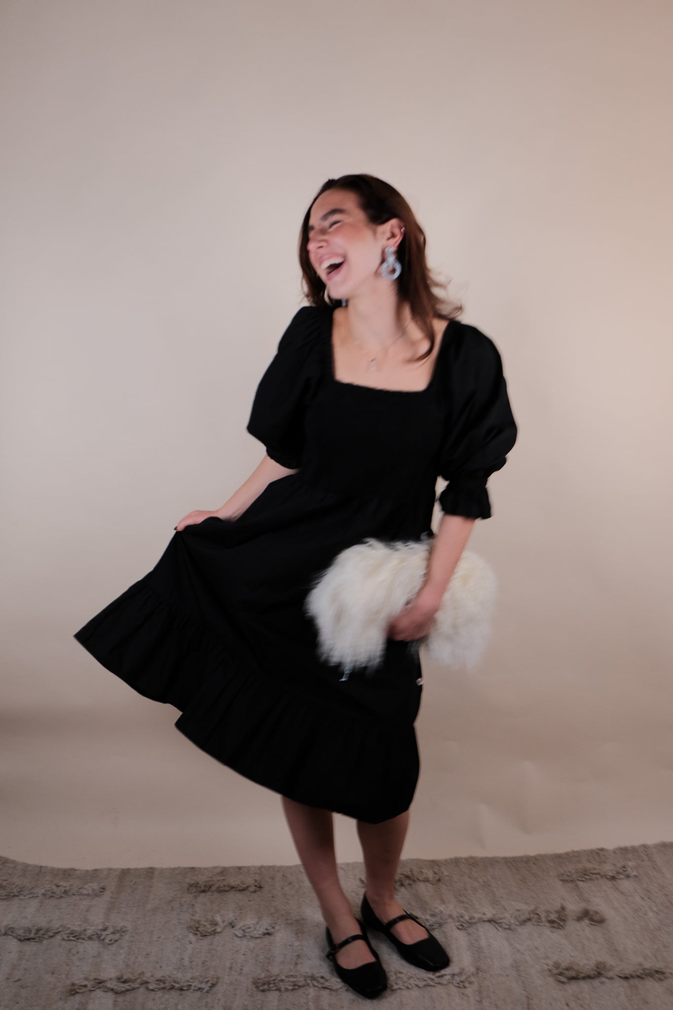 Näyttävä Smock Dress on valmistettu luomupuuvillapopliinista. Mekossa on nelikulmainen pääntie ja istuva smokkirypytetty yläosa. Suurissa puhvihihoissa on olalla kuminauhat, jotka pitävät hihat hyvin paikoillaan. Hihat saa halutessaan vedettyä myös olalta alas off-shoulder-tyyliin. Vajaamittaisten hihojen suissa on frilla yksityiskohdat, jotka on poimutettu kuminauhalla. Midimittaista levenevää helmaa koristaa frilla. Sävynä klassinen musta.