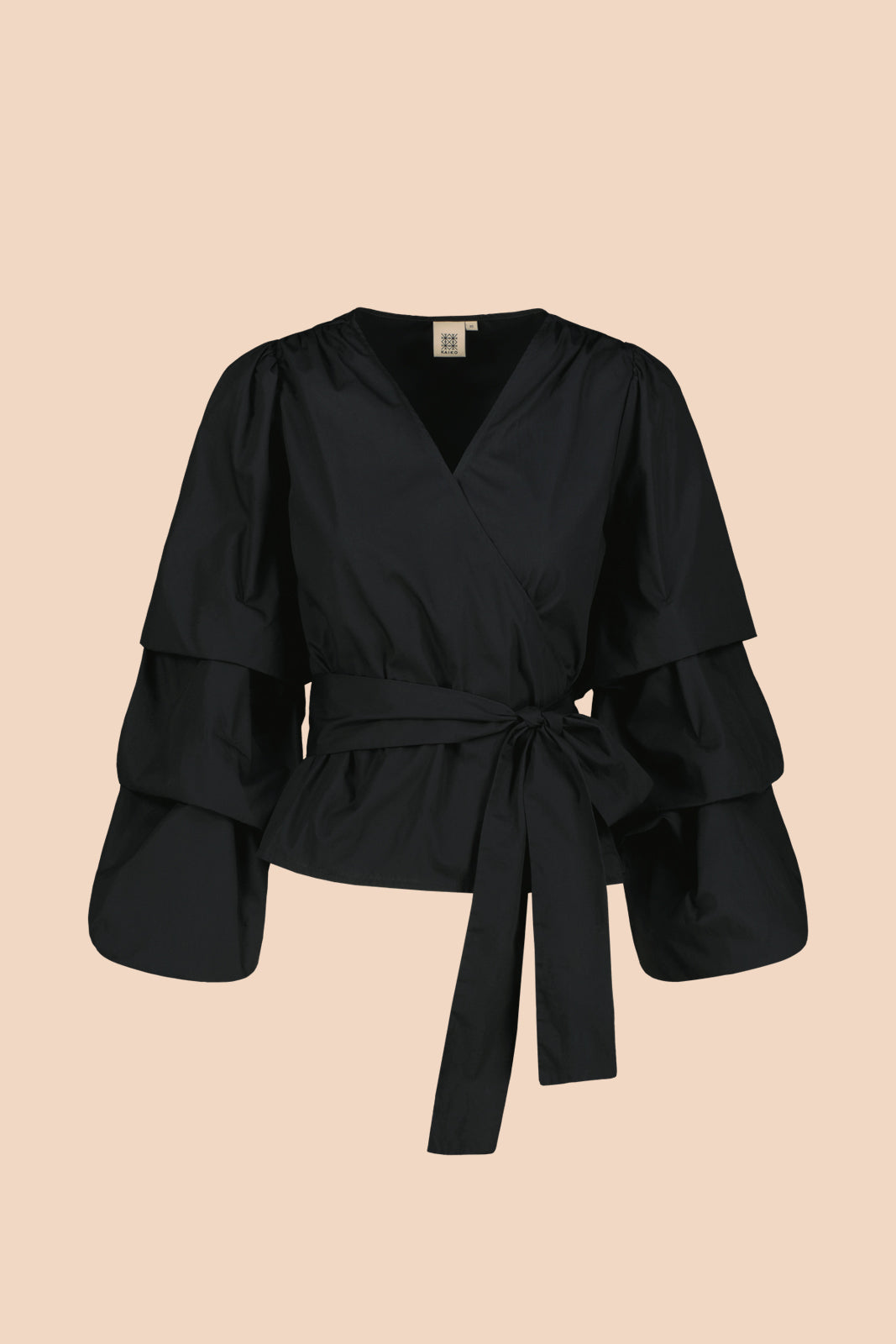 Kietaisupaidassa on solmittavat nauhat vyötäröllä sekä runsaat, kerrostetut täyspitkät hihat. Hihansuut on poimutettu kuminauhalla. Imarteleva kietaisuleikkaus ja säädettävä vyötärönauha varmistavat täydellisen istuvuuden jokaiselle vartalotyypille. Näyttävä ja dramaattinen musta paita on täydellinen valinta juhliin ja muihin erityisiin hetkiin.