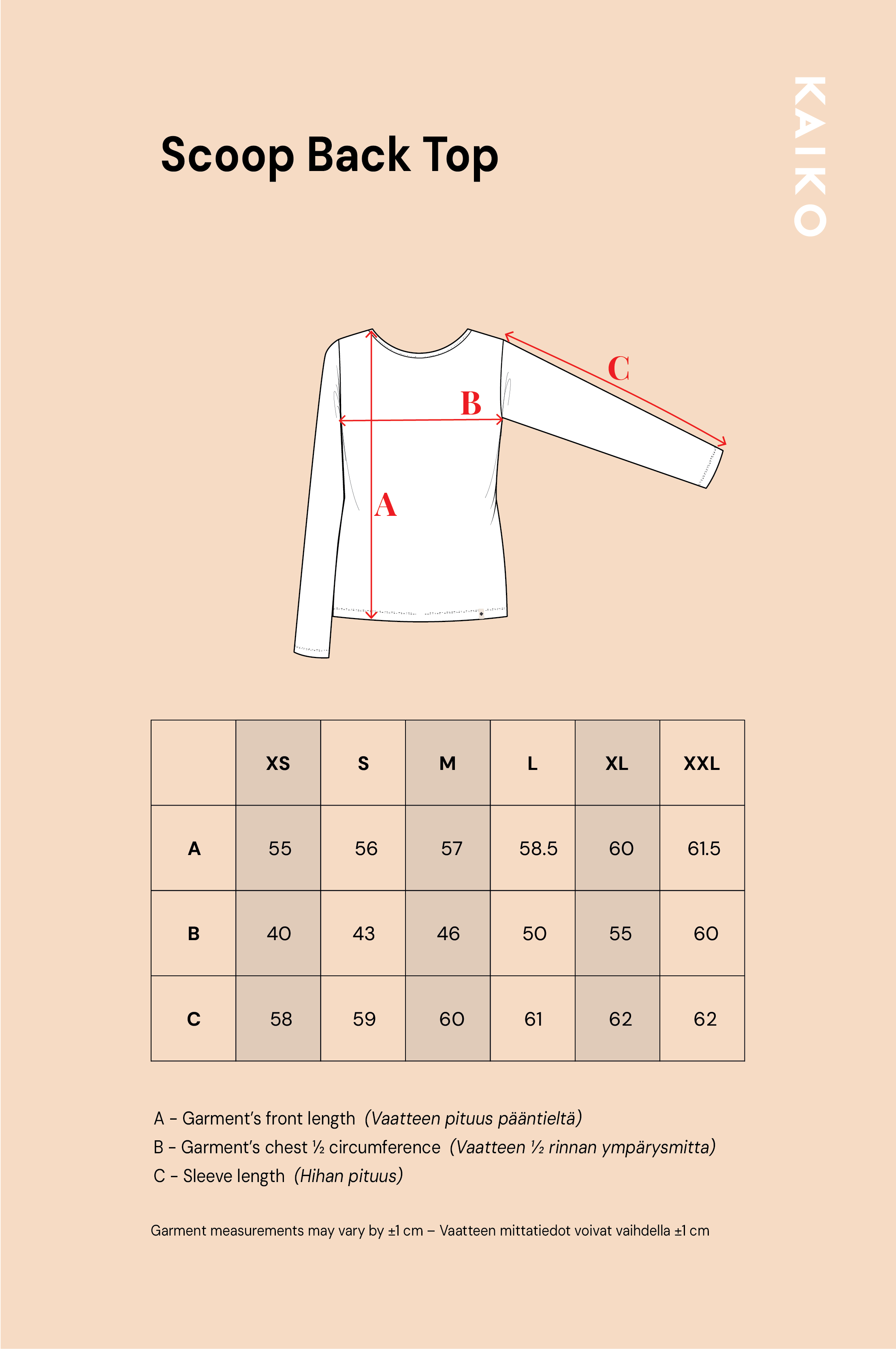 4. Saat myös asiakaspalvelustamme info@kaikoclothing.com nopeaa ja luotettavaa apua koon valintaan.