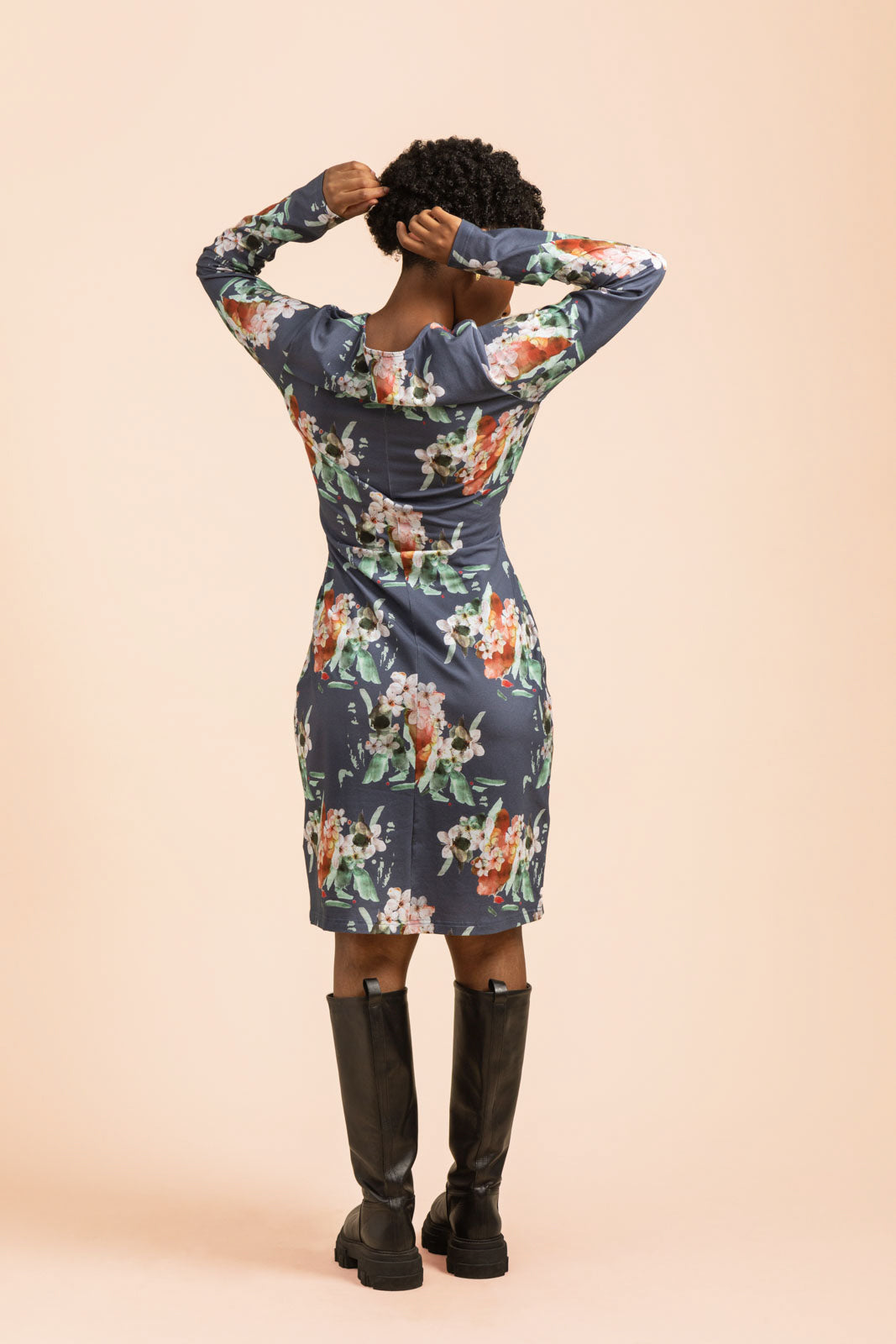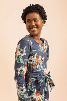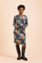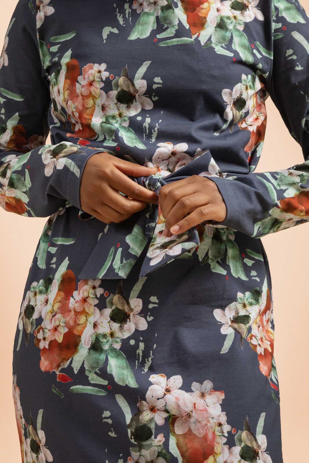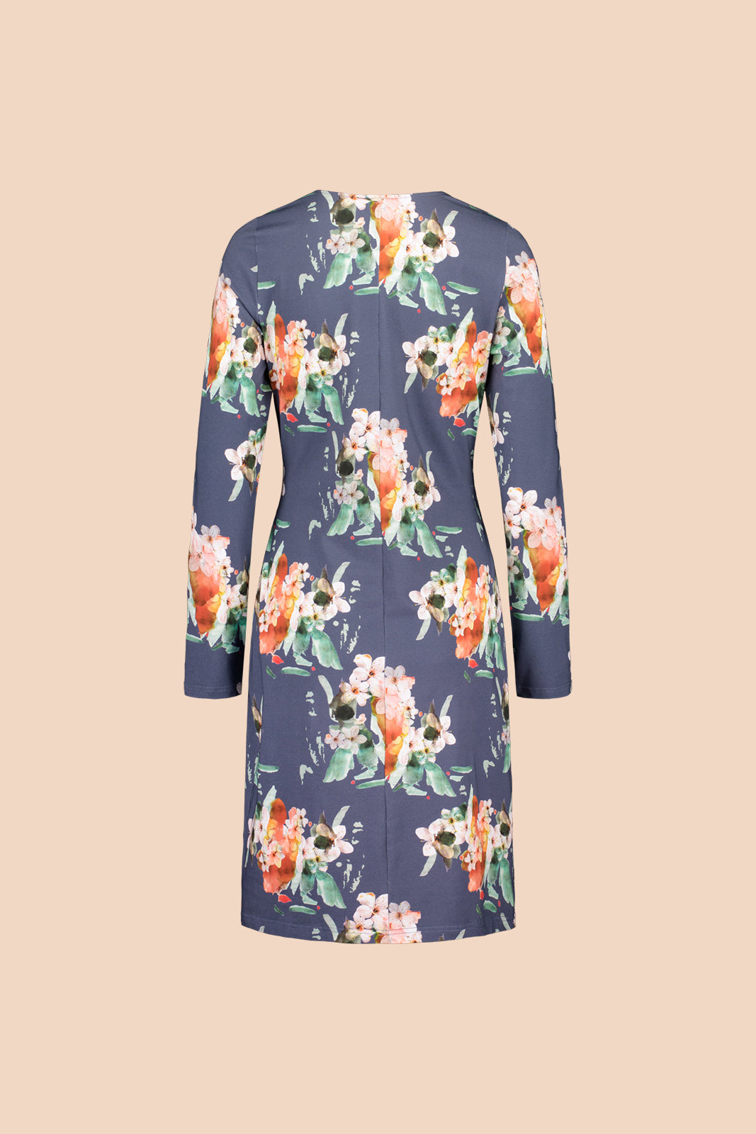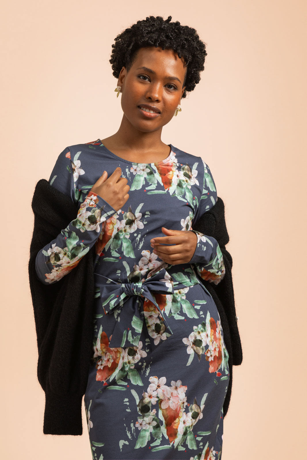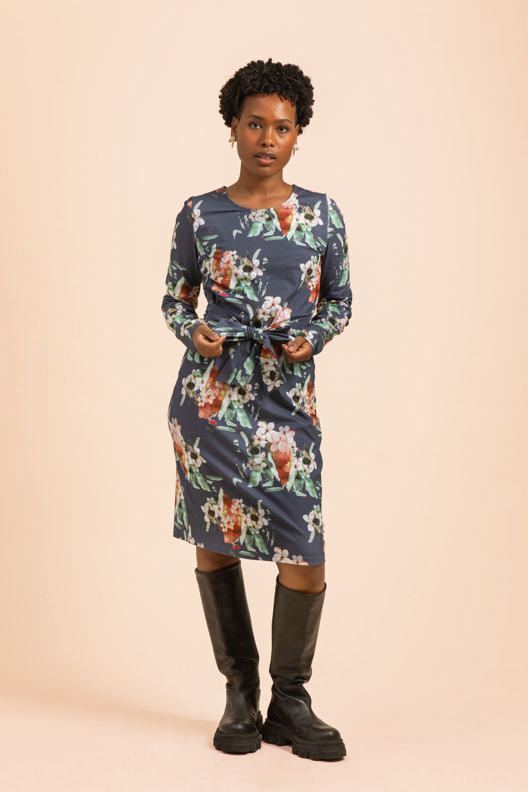 Pehmeästä luomupuuvillatrikoosta valmistettu Belted Dress on malliltaan naisellinen ja ihonmyötäinen. Mekon sivusaumoissa on vyötäröä korostavat leveät nauhat, jotka voi solmia joko eteen tai taakse. Mekossa on pitkät hihat, o-pääntie ja helman pituus on noin polvimittainen. Trikoomekon kuosina Kaiko-klassikko, Blue Blossom.