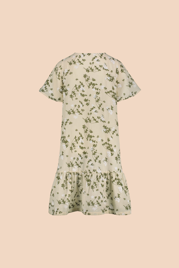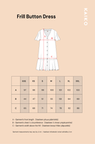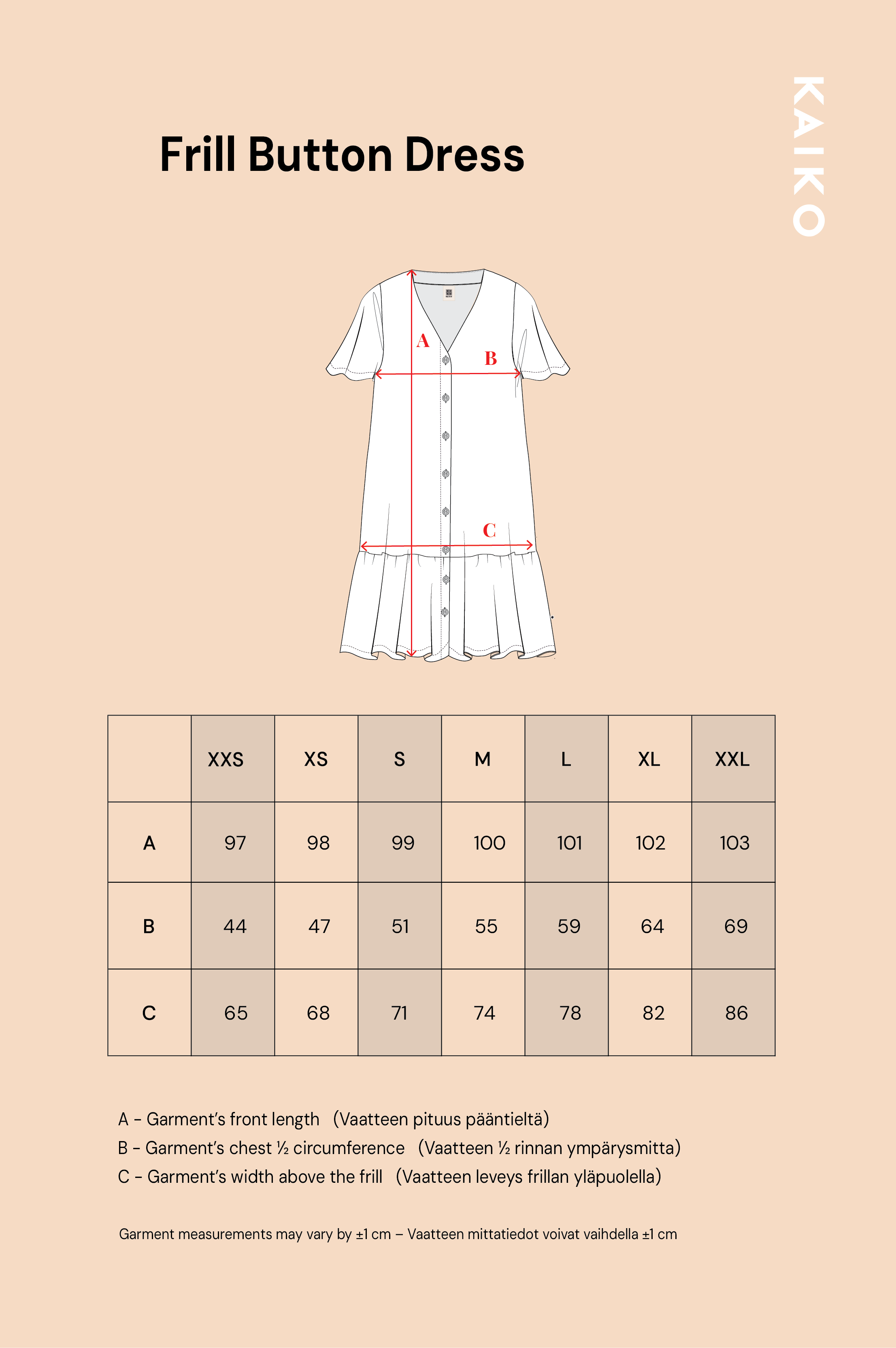 Vastuullisesti valmistetussa mekossa on väljä istuvuus, v-pääntie, kevyesti kellotetut hihat ja keskellä edessä kulkee nappirivi. Helmaa koristaa poimutettu frilla. Frillan korkeus 25 cm. Helman pituus noin polvimittainen.
