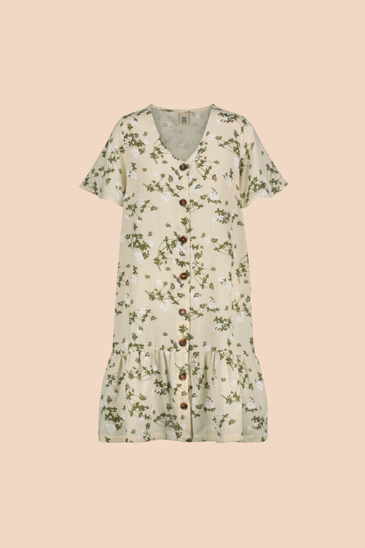 Mukava ja rento naisten mekko Frill Button Dress on valmistettu luomupuuvillamusliinista. Materiaalin valloittavan pehmeä ja eläväpintainen tekstuuri tekee mekosta erityisen mukavan päällä.