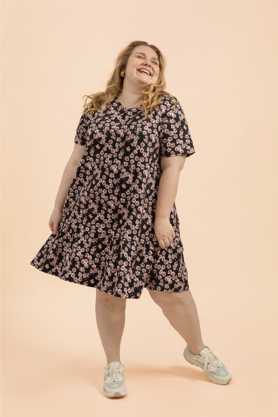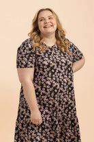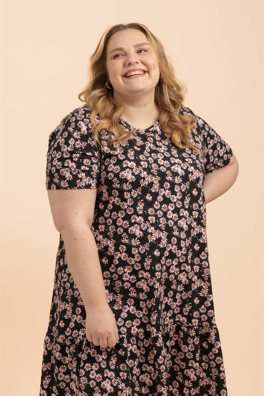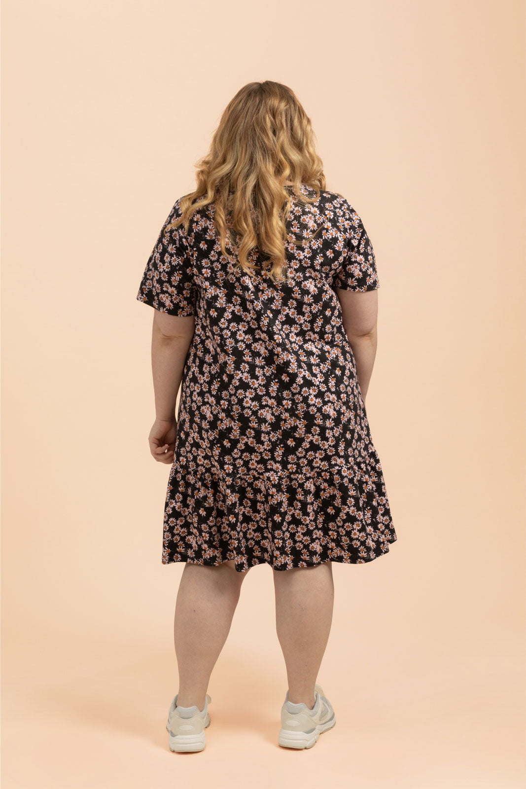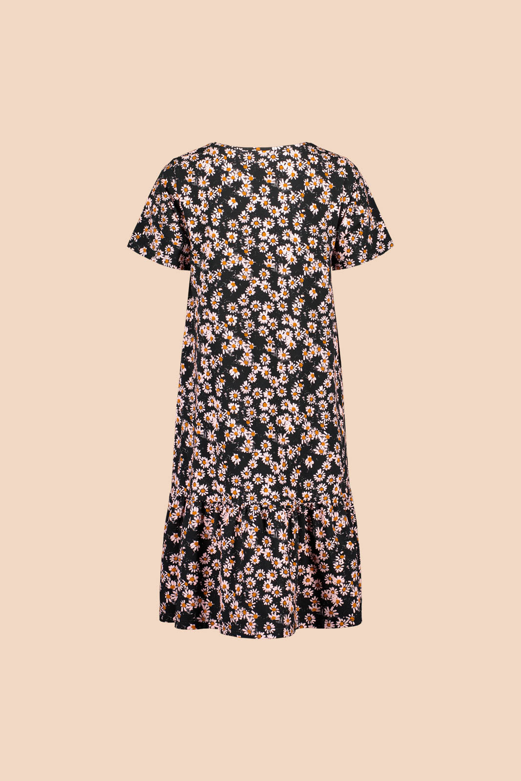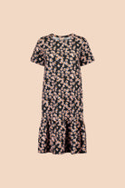 Tämä naisten mekko ihastuttaa rennolla istuvuudellaan ja leikkisillä yksityiskohdillaan - hieman pidennetyt t-paitahihat ja helmaa koristava frilla luovat rennon siluetin. Kuosina ajaton Daisy, jossa päivänkakkarat rönsyilevät mustalla pohjalla.