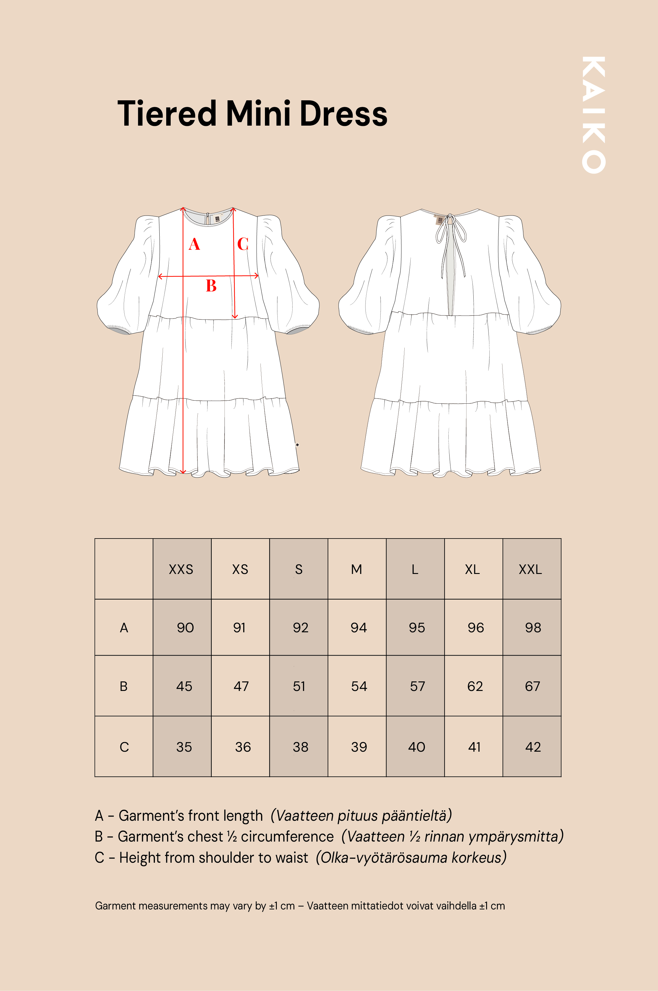 Monikäyttöinen ja näyttävä mekko sopii täydellisesti sekä arkeen että juhlaan. Väljässä leikkauksessa on puolipitkät puhvihihat ja runsas kerrostettu minimittainen helma. Niskassa oleva nauhakiinnitys ja vyötärösaumaan ulottuva syvä halkio keskitakasaumassa viimeistelevät mekon tyylikkään ilmeen.