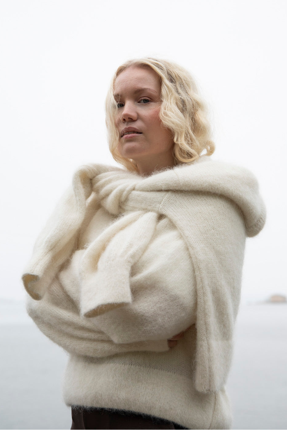 Ajattomassa Alpaca Mohair Jumper -neuleessa on rento siluetti, laskettu olkalinja, väljät hihat, sekä resorit hihansuissa, helmassa ja pääntiellä. Monikäyttöinen neule muuntautuu helposti eri asukokonaisuuksiin – niin hameisiin, farkkuihin kuin siisteihin housuihin. Vastuullisesti valmistettu neule luo myös kauniita kerroksia puettuna esimerkiksi mekon päälle, mikä tekee siitä täydellisen valinnan sekä arkeen että juhlaan. Neuleen värinä luonnonvalkoinen.