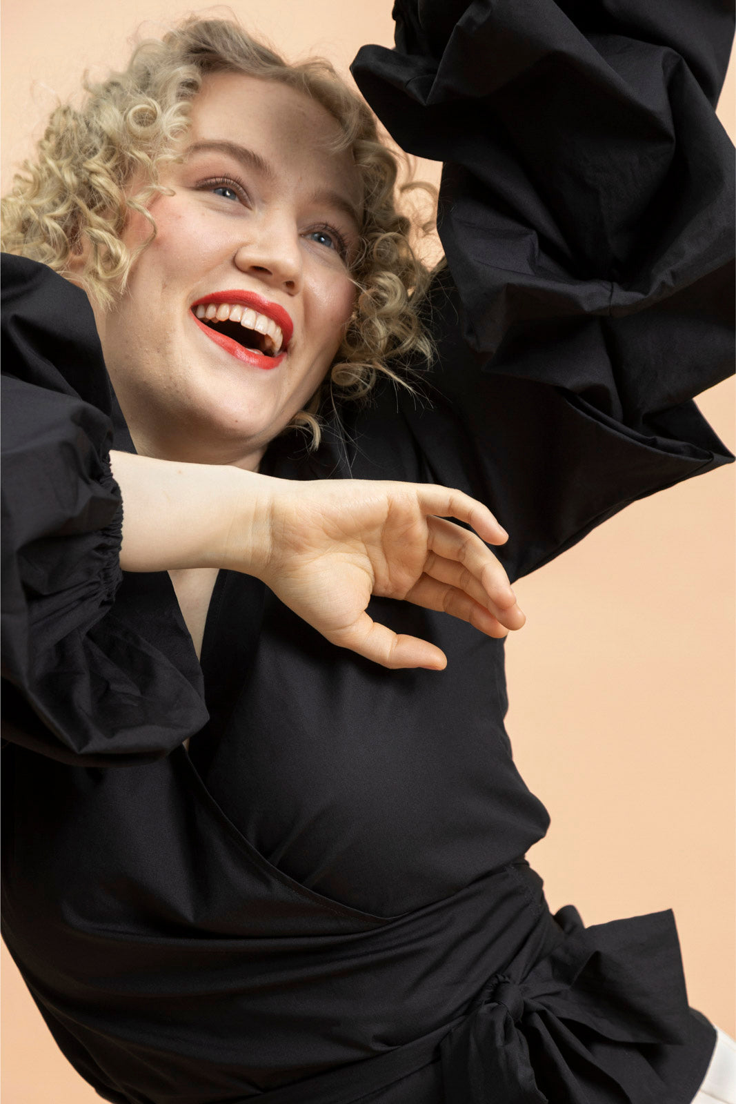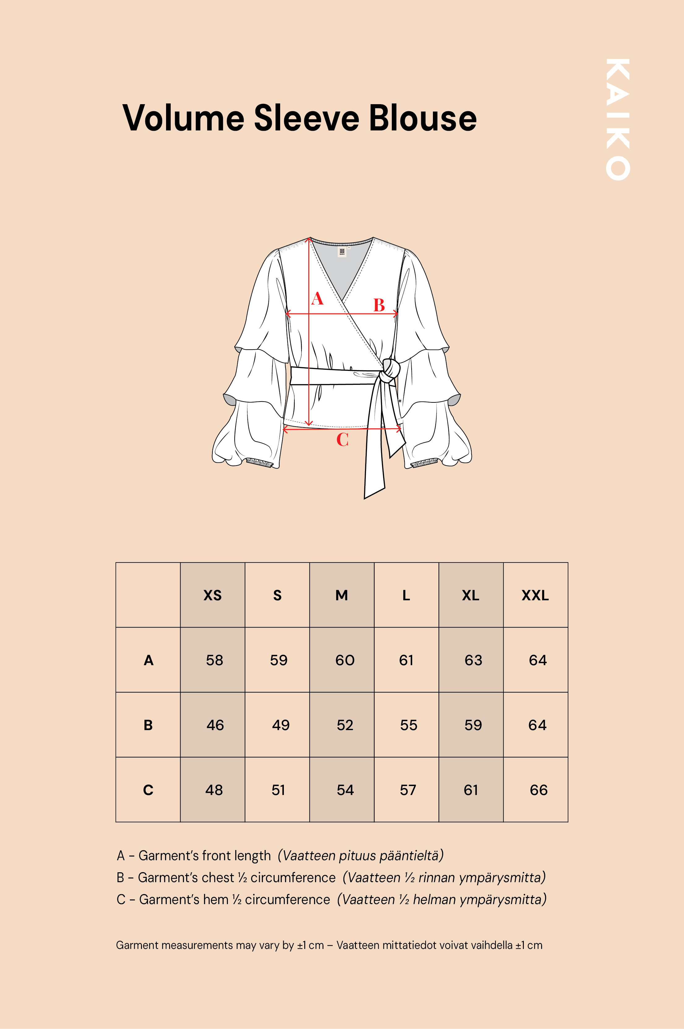Die Volume Sleeve Blouse – Wickelbluse fällt größengetreu aus. Nutze die Körpermaß-Tabelle und die Kleidungsmaße (letztes Bild), um deine passende Größe zu finden. Das Model ist 164 cm groß und trägt Größe XS.