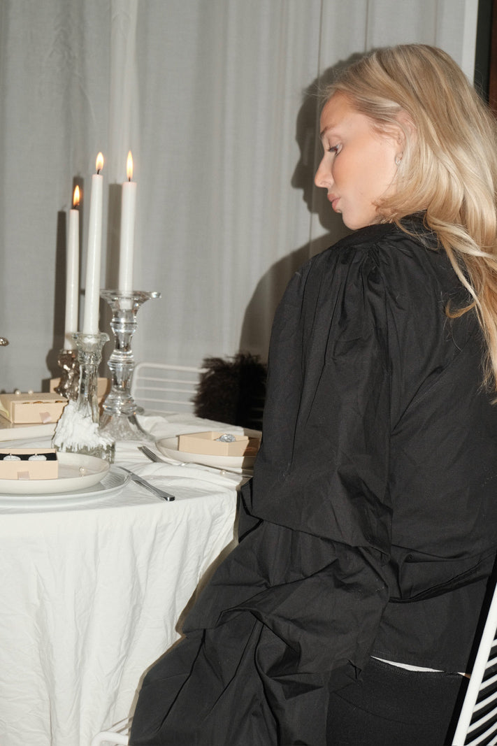Die auffällige Volume Sleeve Bluse ist aus strukturierter Bio-Baumwollpopeline gefertigt, die eine dichte und glatte Oberfläche hat.