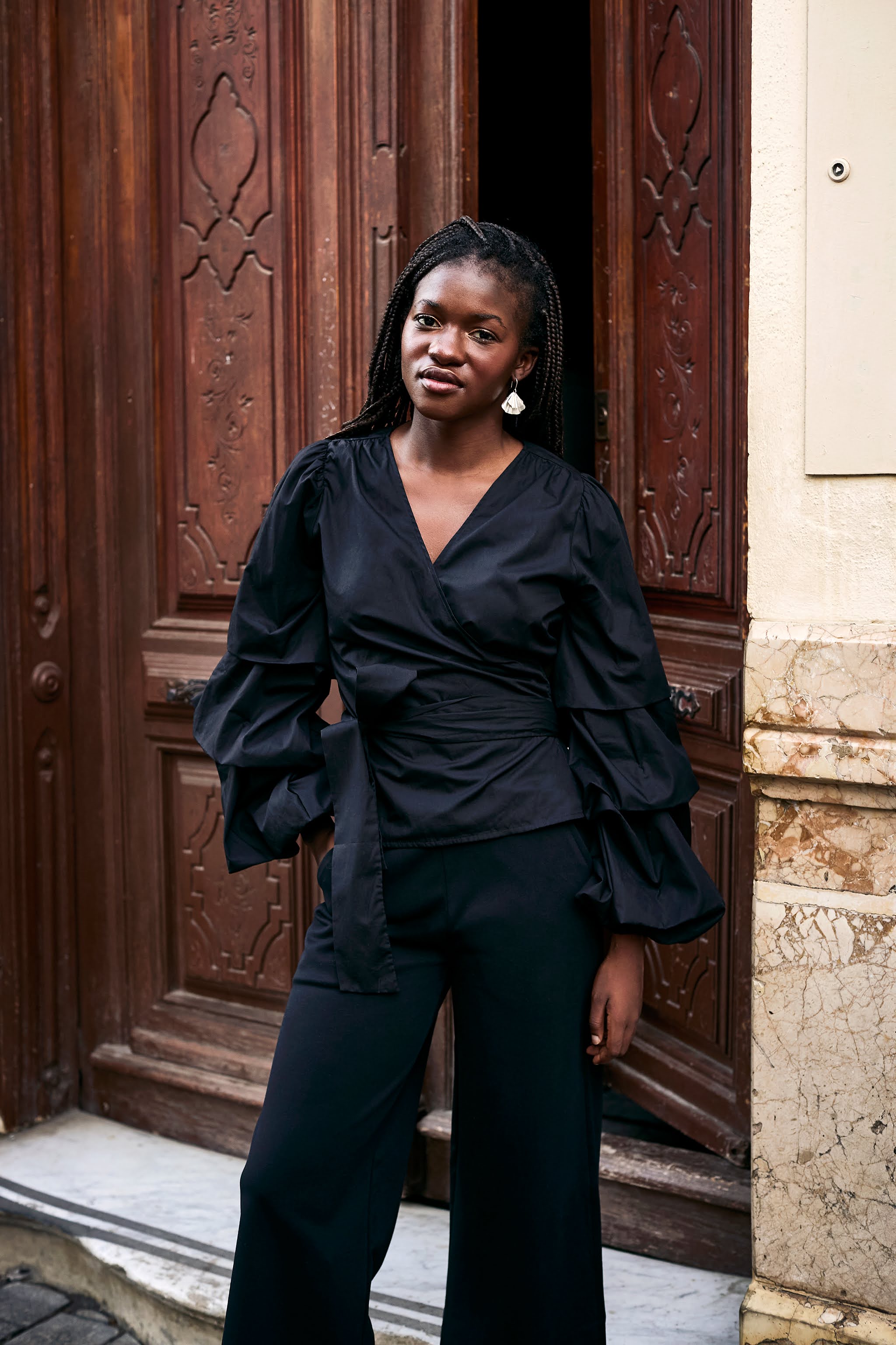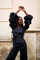 Die Wickelbluse wird mit Bindebändern in der Taille geschlossen und hat voluminöse, geschichtete lange Ärmel. Die Ärmelabschlüsse sind mit einem Gummizug gerafft. Der schmeichelhafte Wickelschnitt und das verstellbare Taillenband sorgen für eine perfekte Passform für jede Figur. Die dramatische schwarze Bluse ist die ideale Wahl für Feste und besondere Anlässe.