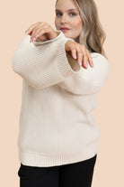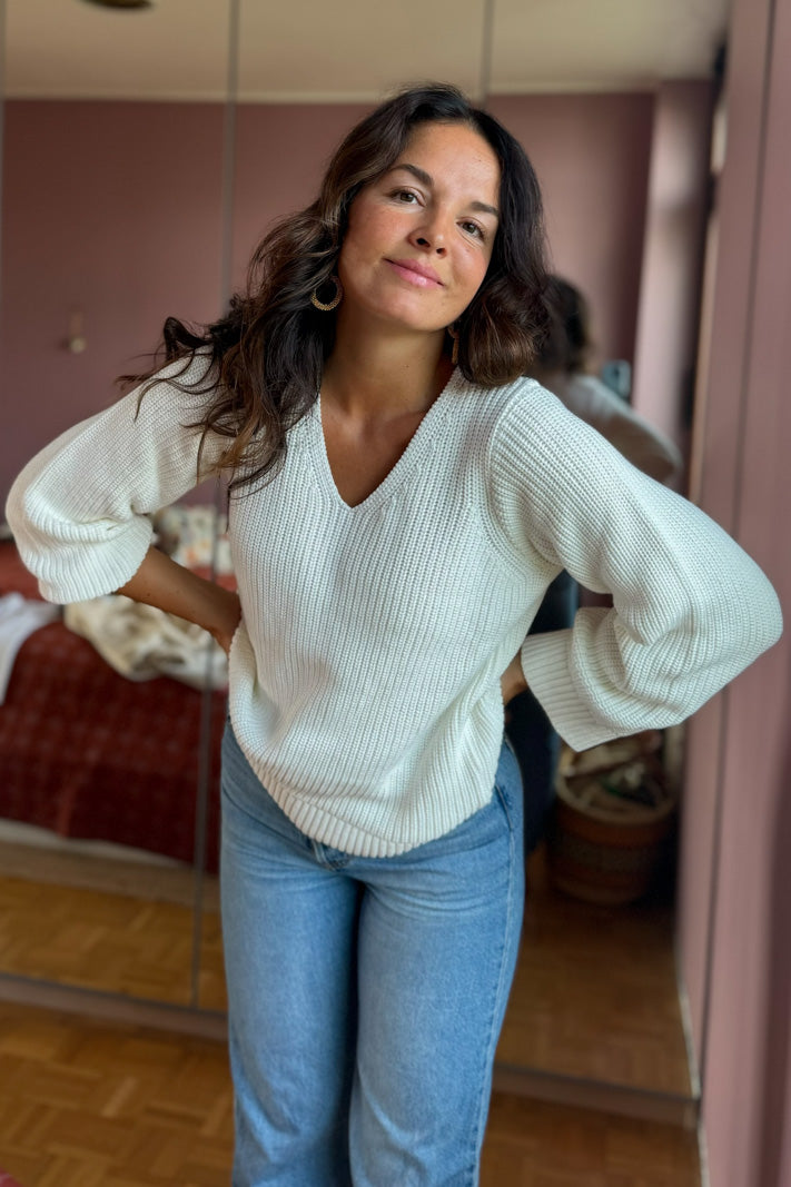 Der dicke Baumwollpullover Jumper mit V-Ausschnitt besteht aus 100 % Bio-Baumwolle. Der Pullover hat einen V-Ausschnitt, eine taillierte Schulterpartie und weite Ärmel in voller Länge. Der Saum und die Ärmelbündchen sind gerippt. Das Modell des Pullovers ist entspannt und locker. Der Farbton ist zeitloses gebrochenes Weiß.