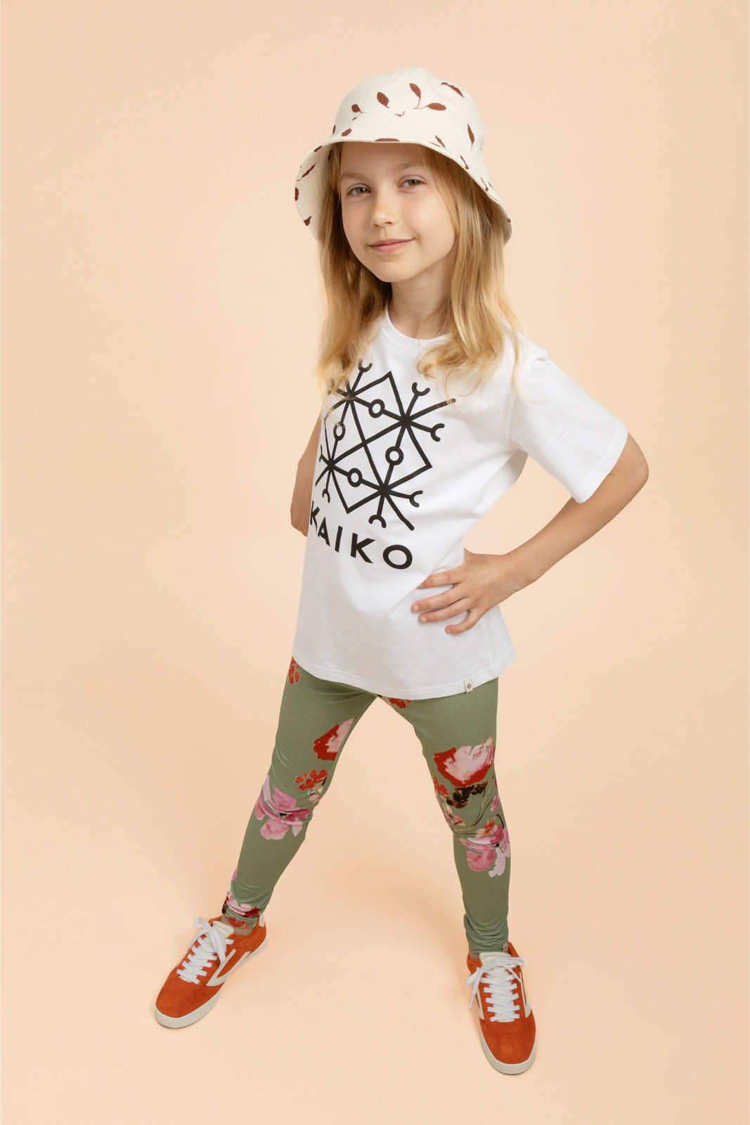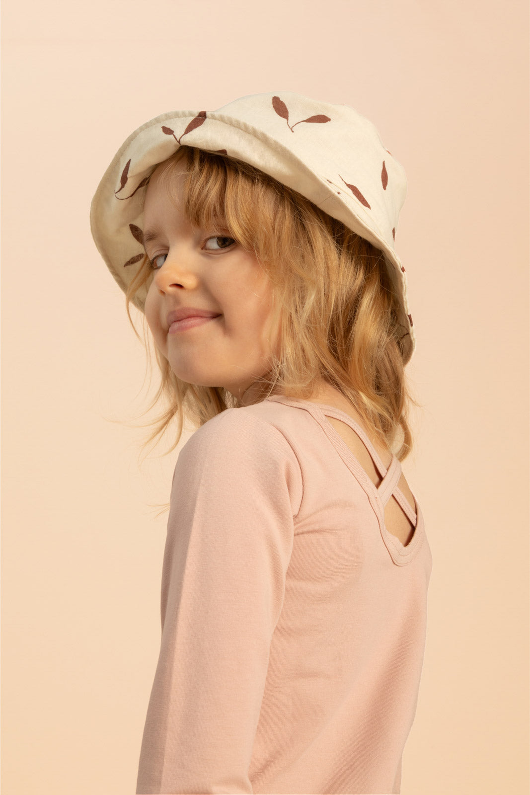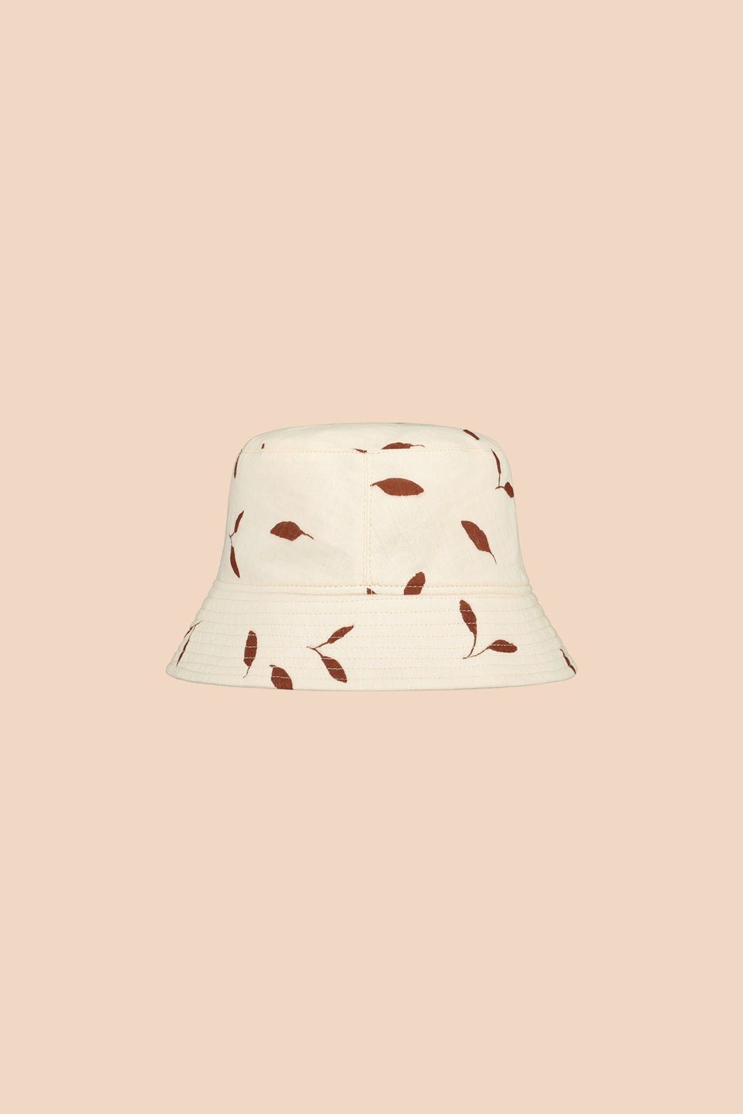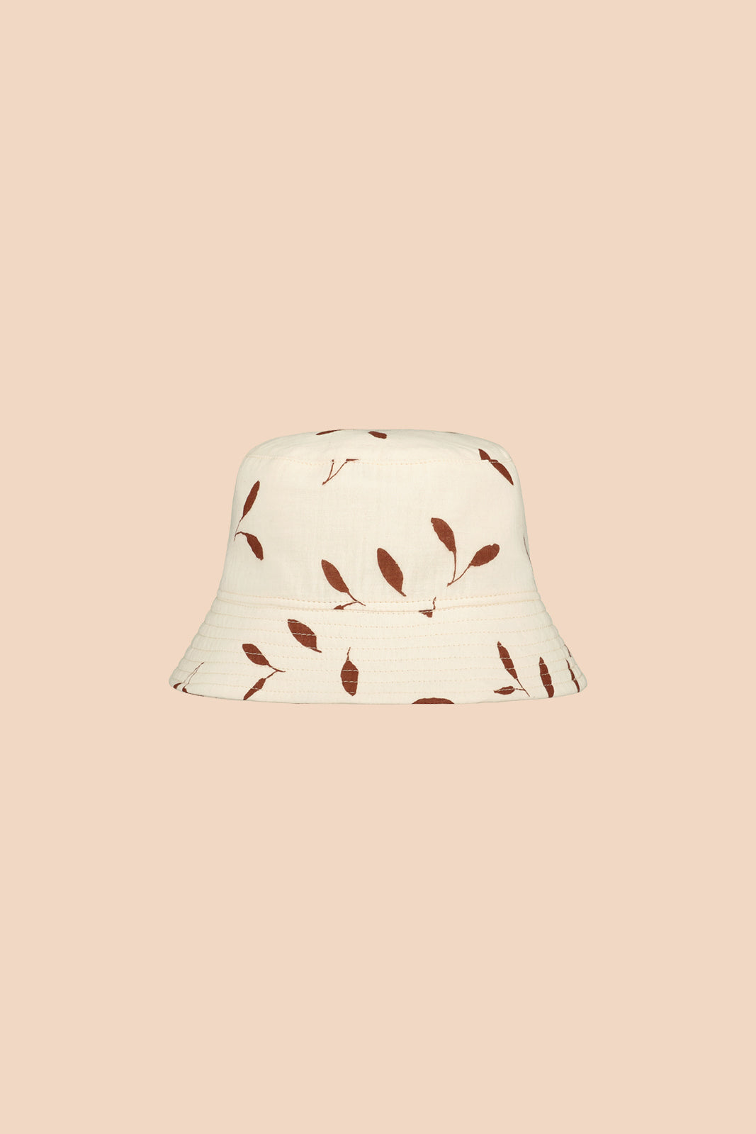 Der lässig-elegante Bucket Sun Hat ist aus weichem Musselin aus 100% Bio-Baumwolle gefertigt. Das Muster ist ein ruhiger Wind, mit mahagonifarbenen Blättern, die auf einem hellen Hintergrund schweben.
