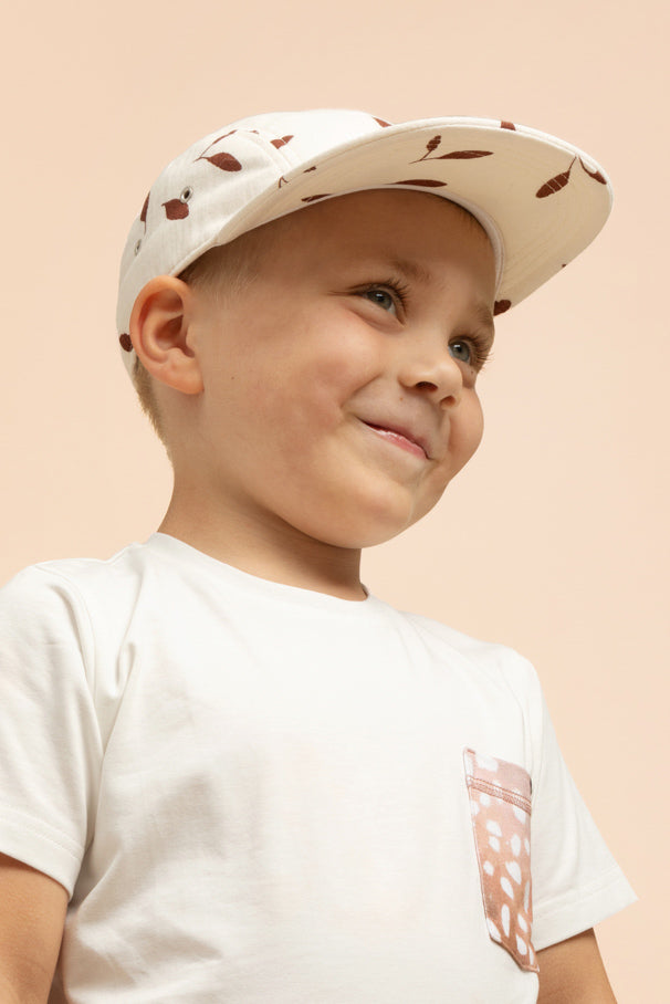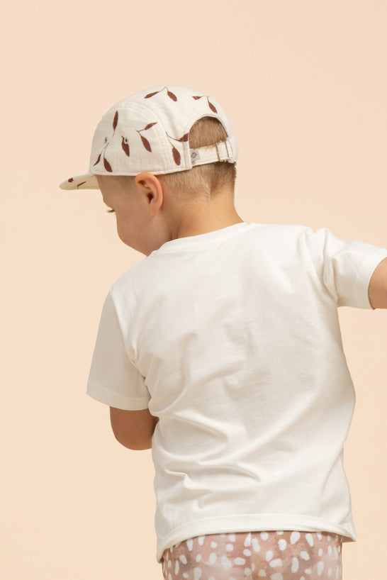 Diese Mütze ist aus weichem und atmungsaktivem Bio-Baumwollmusselin gefertigt und zeigt Kaikkos Lieblingsmuster: den ruhigen Wind. Die Krempe der 5-Panel-Mütze schützt Ihr Gesicht gut vor der Sonne, und der verstellbare Riemen auf der Rückseite sorgt für einen perfekten Sitz. Da die Mütze verstellbar ist, passt sie allen, von Schulkindern bis zu Erwachsenen.