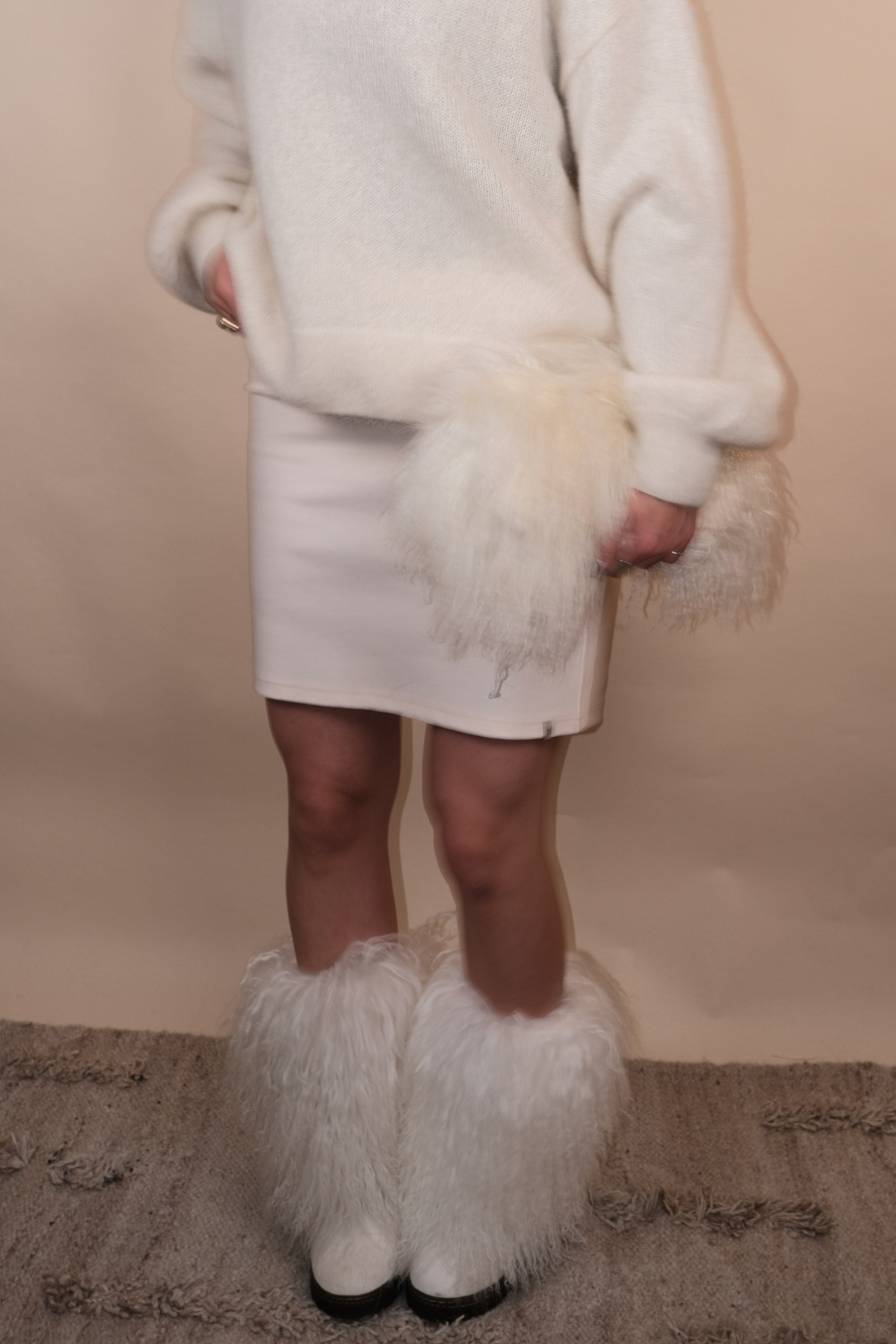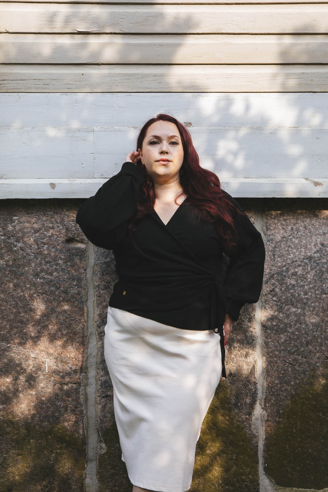 Der Rock hat einen breiten (5 cm hohen) versteckten Gummibund, der auch dann ordentlich aussieht, wenn du dein Oberteil in den Bund steckst. In der hinteren Mitte befindet sich ein 20 cm langer Schlitz. Die Seitennähte sind mit einer Denim-Steppnaht versehen. Der Rock hat eine klassische Länge knapp über dem Knie. Die Farbe des Rocks ist ein warmer, heller Ivory-Ton.