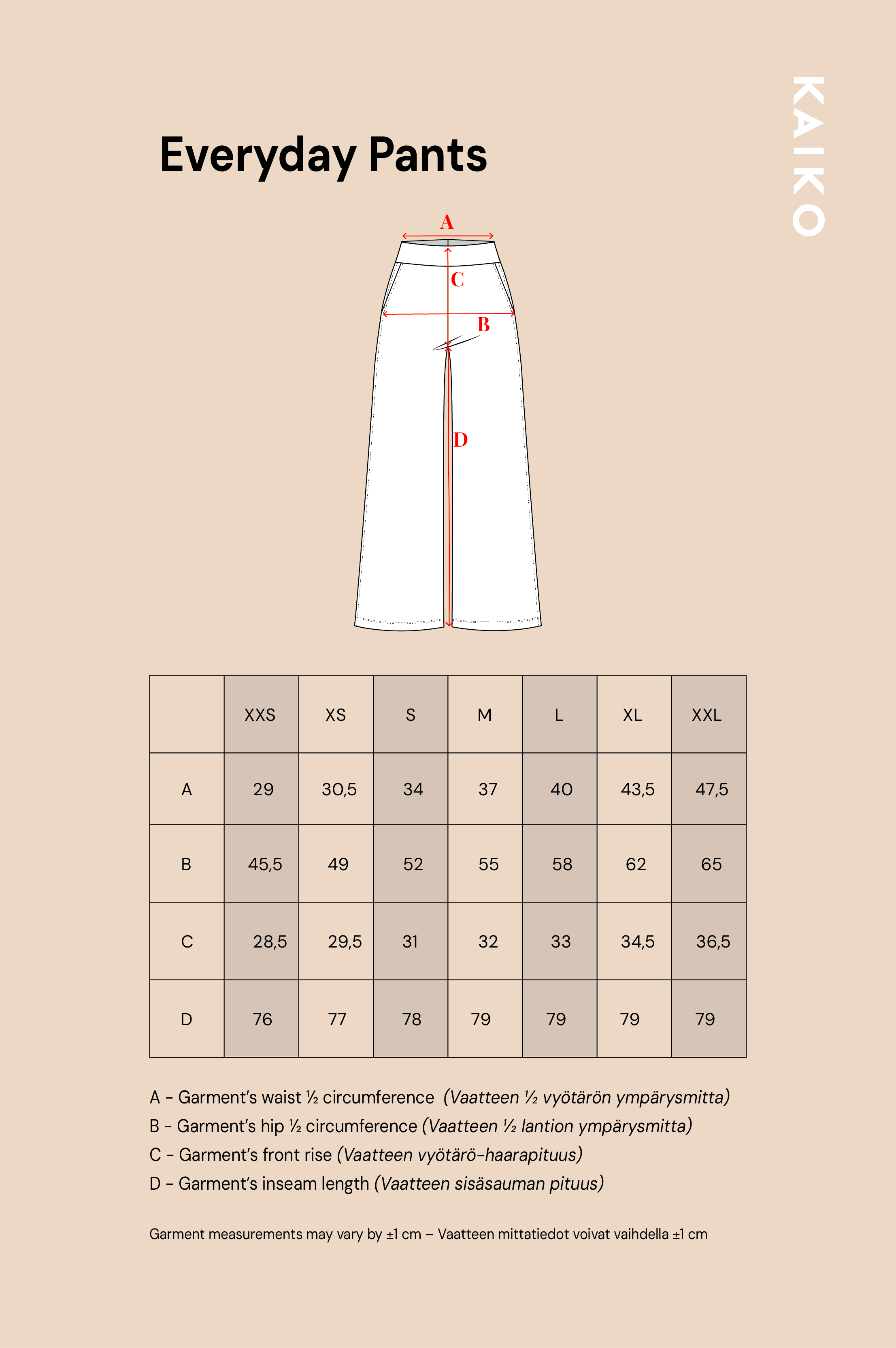 Die Everyday Pants verzichten nicht auf Komfort. Diese Hose aus festem und elastischem Ponte Roma-Interlock-Strick sieht schick aus und fühlt sich wunderbar weich an. Sie verfügt über einen breiten, elastischen Bund (5 cm hoch) und Taschen an der Vorderseite. Die Seitennähte sind mit Denim-Steppnähten versehen, die der Hose einen besonders scharfen Look verleihen. Die Hose hat eine volle Beinlänge (siehe die Innenbeinlängen in der Maßtabelle, letztes Bild).