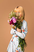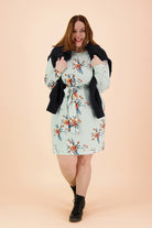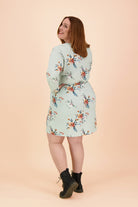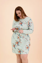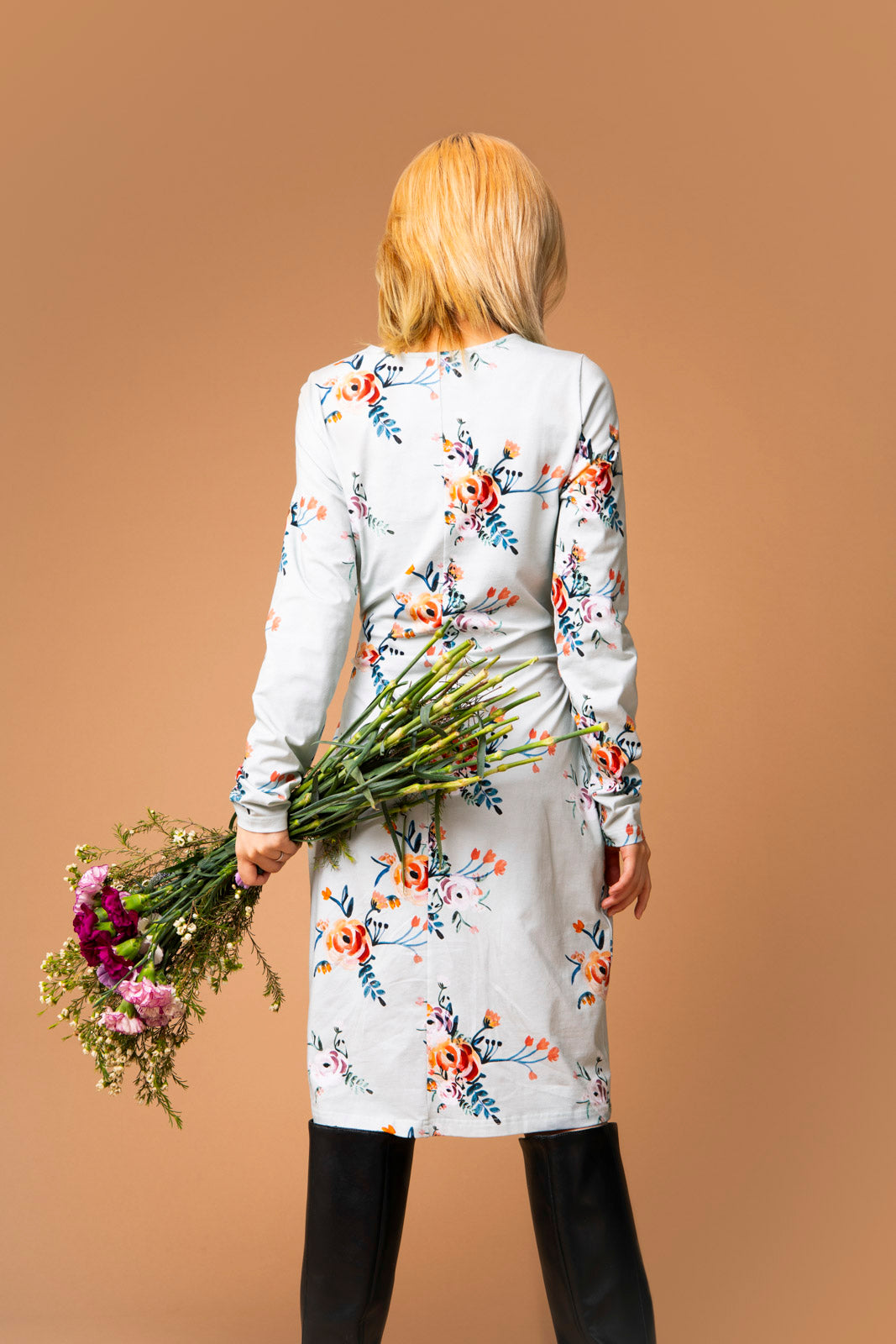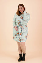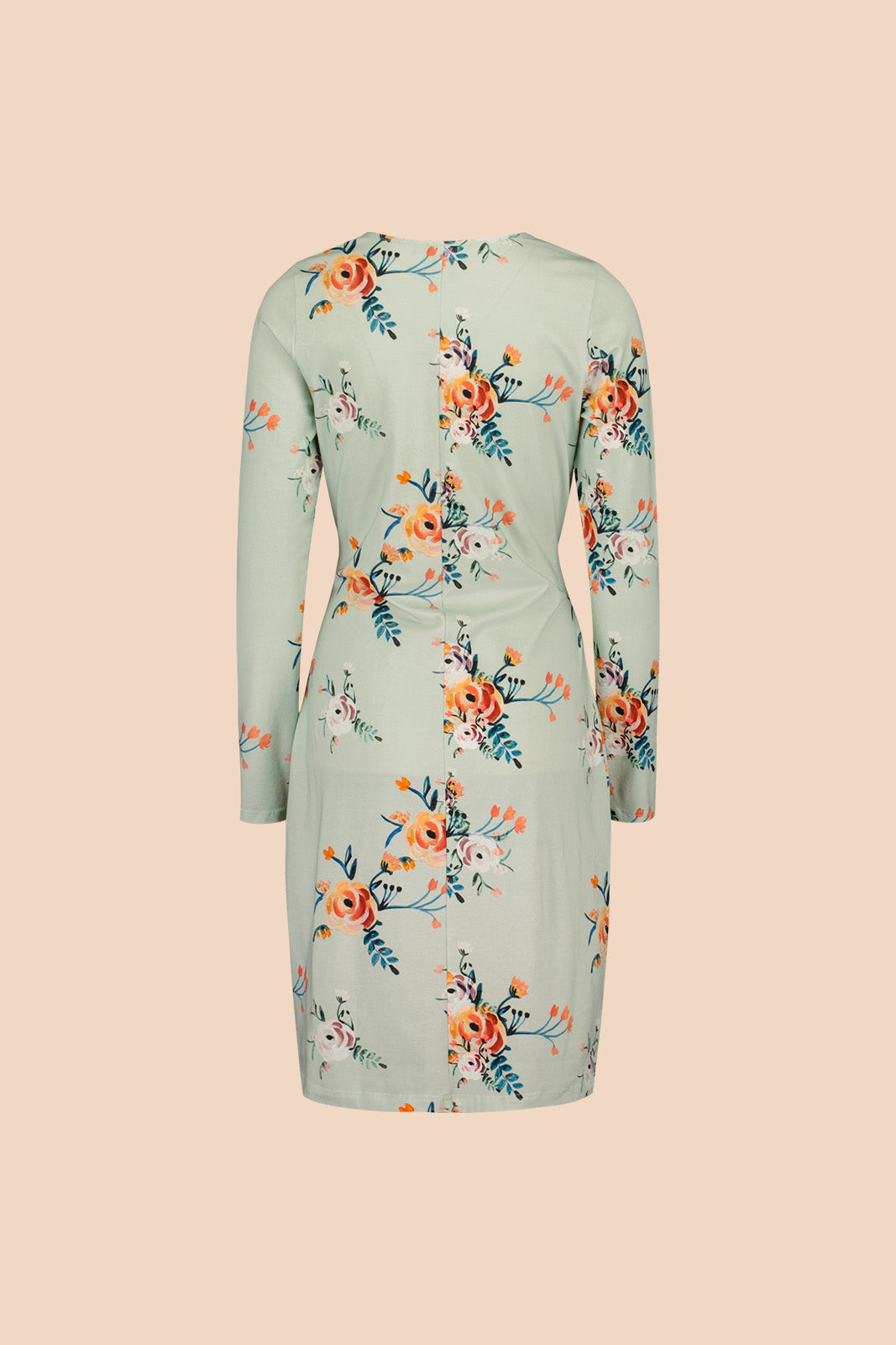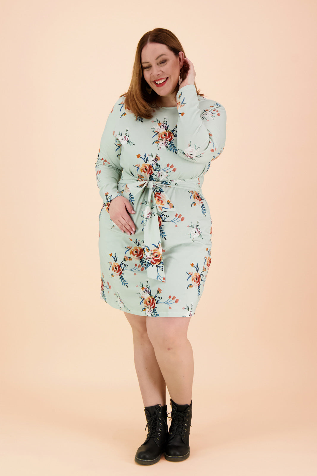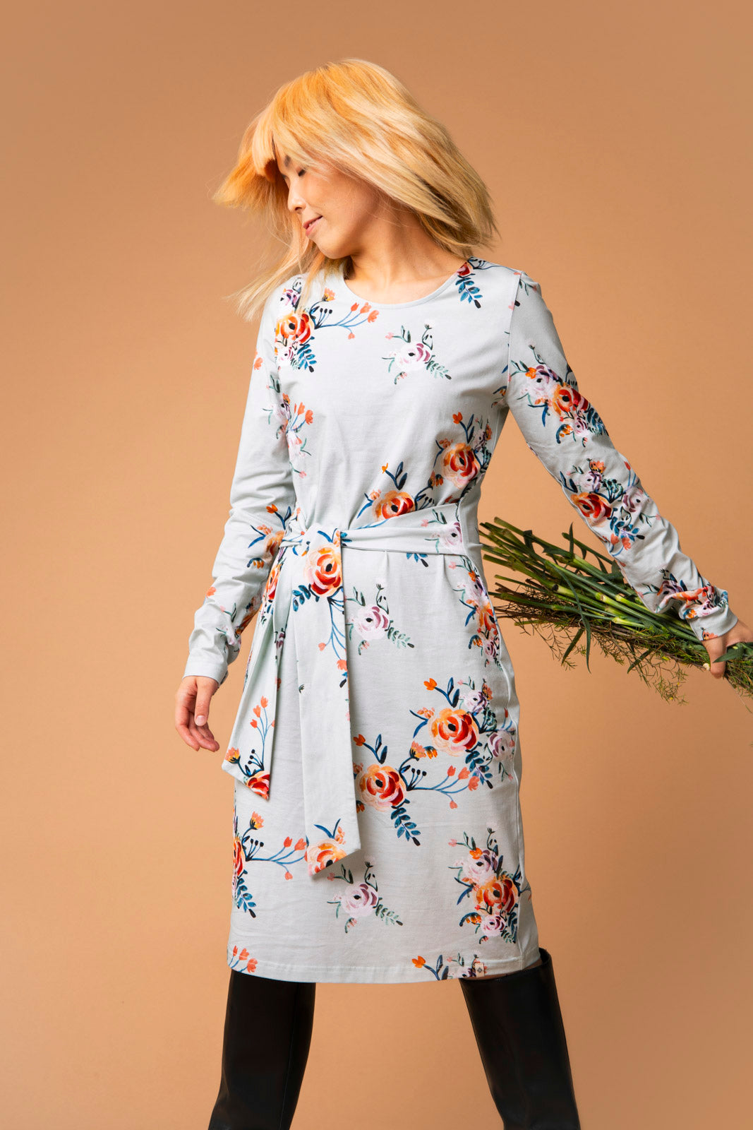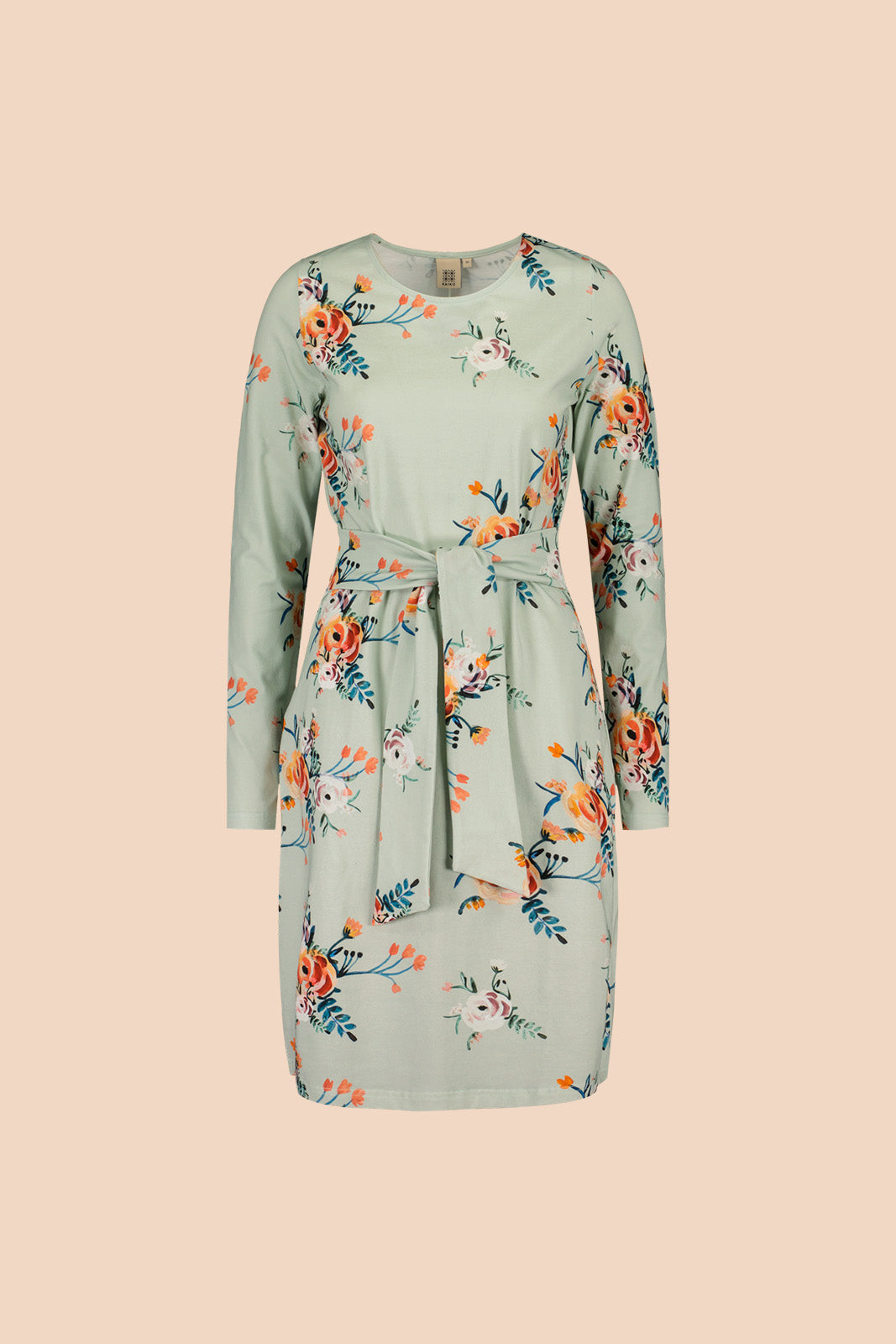 Das Belted Dress aus weichem Bio-Baumwolljersey hat eine feminine, figurbetonte Passform. Die seitlichen Nähte des Kleides sind mit breiten Bändern versehen, die die Taille betonen und entweder vorne oder hinten gebunden werden können. Das Kleid verfügt über lange Ärmel, einen runden Halsausschnitt und eine Saumlänge, die etwa bis zum Knie reicht. Das Trikotkleid ist im Jade Bloom-Muster gehalten, bei dem prächtige Rosen auf einem jadegrünen Hintergrund blühen.
