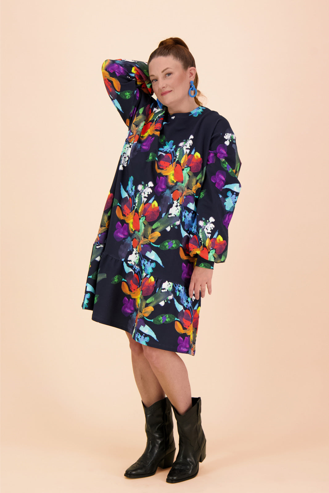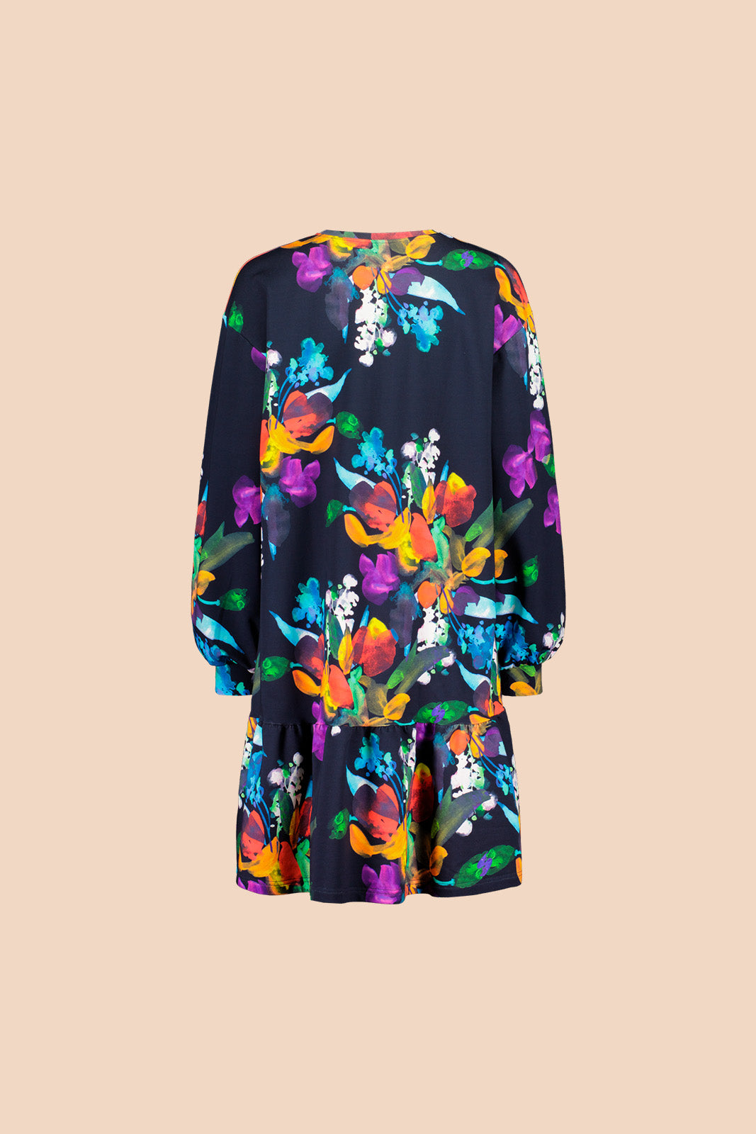 Unser Ruffle Sweatshirt Dress ist aus wunderbar weichem Bio-Baumwoll-Jersey gefertigt. Dieses Sweatshirt-Kleid hat eine lockere Oversize-Passform, eine eher kurze Saumlänge, eine tief angesetzte Schulterpartie, lange Ärmel und einen verspielten Rüschensaum. Das Kleid ziert ein Bouquet-Muster, das aus vollen, üppigen Blumensträuße besteht. Die Farben der Blumen umfassen kräftiges Rot, Violett, Blau und Weiß. Der dunkelblaue Hintergrund betont die Helligkeit der Farben und macht das Muster zu einem auffälligen und köstlichen Hingucker.