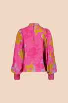 Die Puffbluse hat große, voluminöse Ärmel und die Manschetten sind mit einer schönen gesmokten Raffung verziert. Der Stehkragen hat stylische beschichtete Knöpfe und einen kleinen Schlitz auf der Rückseite. Als Muster Super Pink, wo sich große ockerfarbene Blüten auf einem rosa Hintergrund ausbreiten.