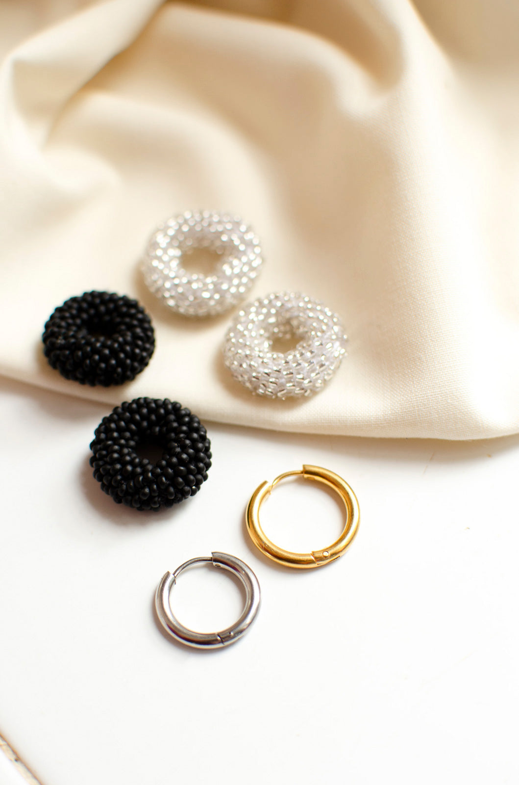 Upeat Veda-korvakorut on valmistettu käsityönä. Korvakorut on punottu lasihelmistä ja niiden rengasosa on kestävää kullan sävyistä ruostumatonta terästä. Osat ovat irrotettavat. Korun koko pituus on noin 3cm.