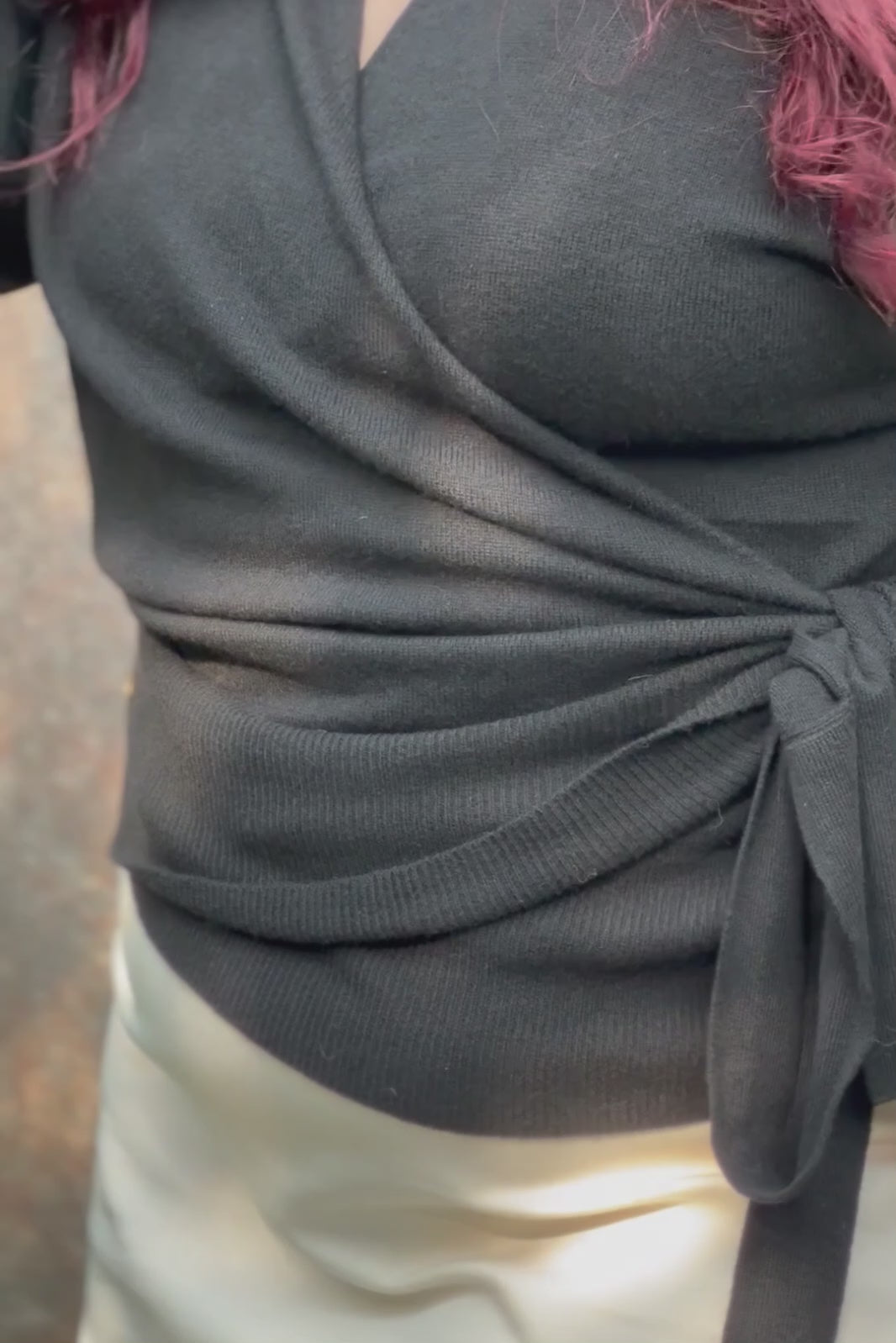 Die klassische Strickjacke hat einen Wickelschnitt, der deine Taille betont und sich mit den Bändern individuell anpassen lässt. So kannst du die Passform genau nach deinem Geschmack einstellen. Der Cardigan hat lange, lockere Ärmel sowie Rippbündchen an Ärmeln und Saum. Die Farbe ist klassisches Schwarz.