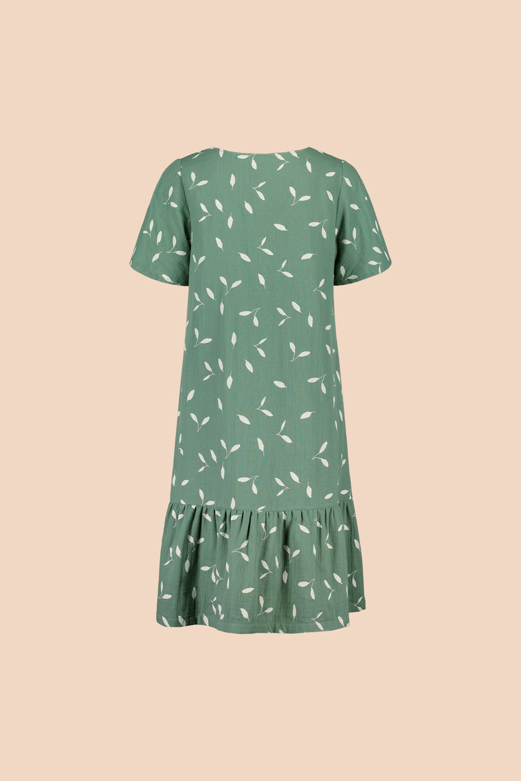 Das verantwortungsvoll hergestellte Kleid hat eine lockere Passform, einen V-Ausschnitt, leicht ausgestellte Ärmel und eine Knopfleiste in der vorderen Mitte. Der Saum wird durch eine geraffte Rüsche verziert. Die Rüsche ist 25 cm hoch, und die Saumlänge reicht etwa bis zum Knie. Das Muster Sage Wind zeigt minimalistische Blattmotive auf einem gedeckten grünen Hintergrund.
