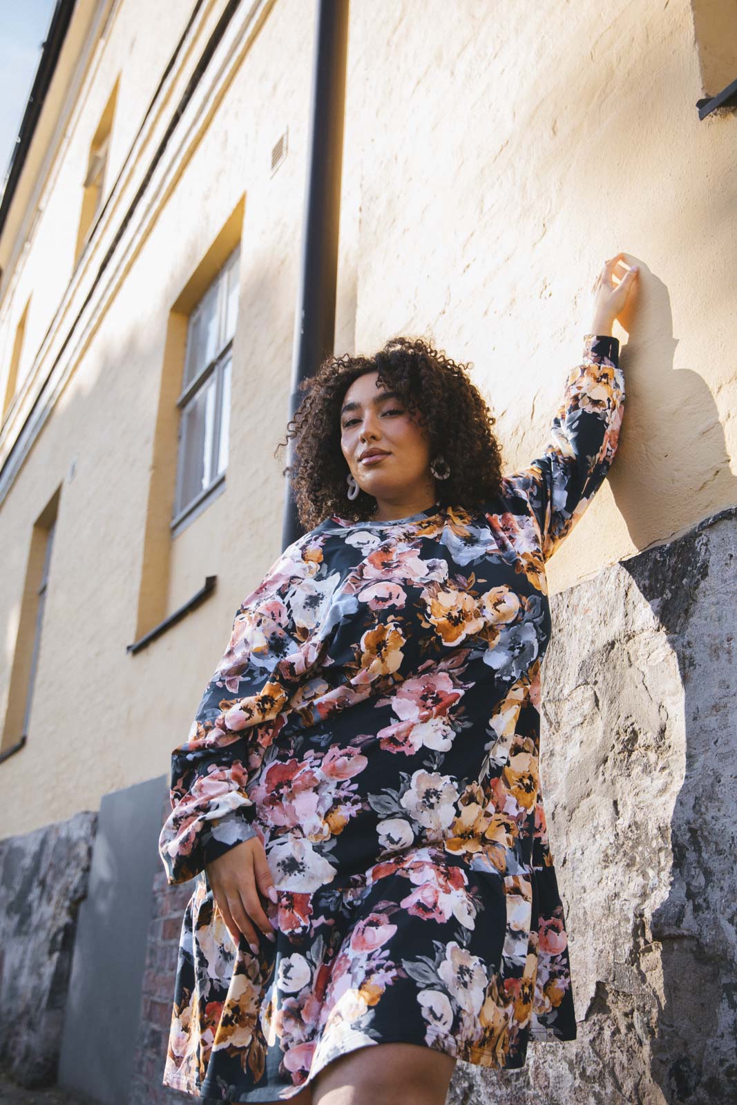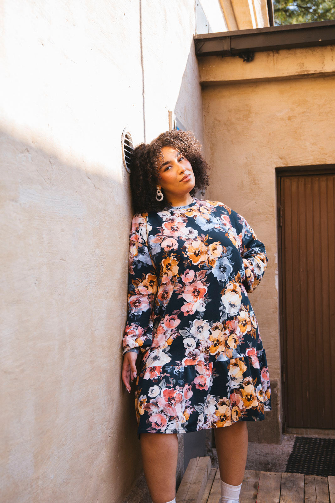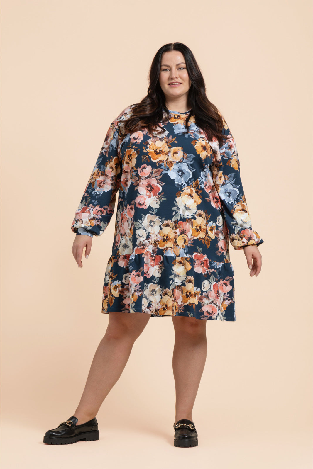 Dieses verantwortungsvoll hergestellte Sweatshirt-Kleid begeistert mit seiner entspannten Oversize-Passform und dem verspielten Rüschendetail am Saum. Das weiche Kleid hat eine etwas kürzere Länge, überschnittene Schultern und lange Ärmel. Das Design zeigt das petrolblaue Blumenmuster Moss Rose.