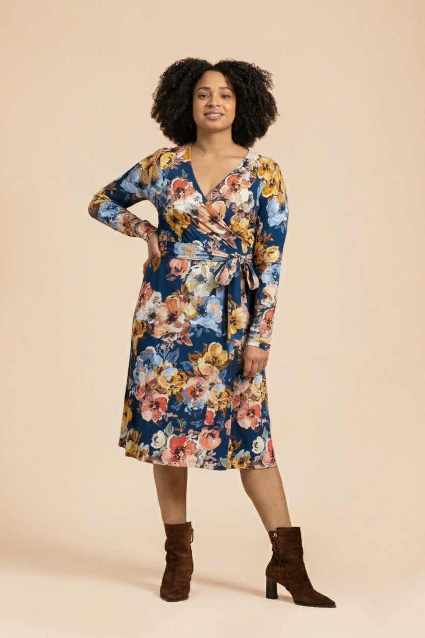 Das stilvolle Wickelkleid passt perfekt sowohl in deinen Alltag als auch zu festlichen Anlässen. Der bequeme und feminine Schnitt an der Taille sowie die leicht verstellbaren Bänder sorgen für eine ideale Passform für jede Körperform. Lange Ärmel und der über-knielange Saum schaffen eine klassische Silhouette, die das Kleid zu einer zeitlosen und vielseitigen Wahl für jede Gelegenheit macht.