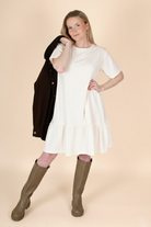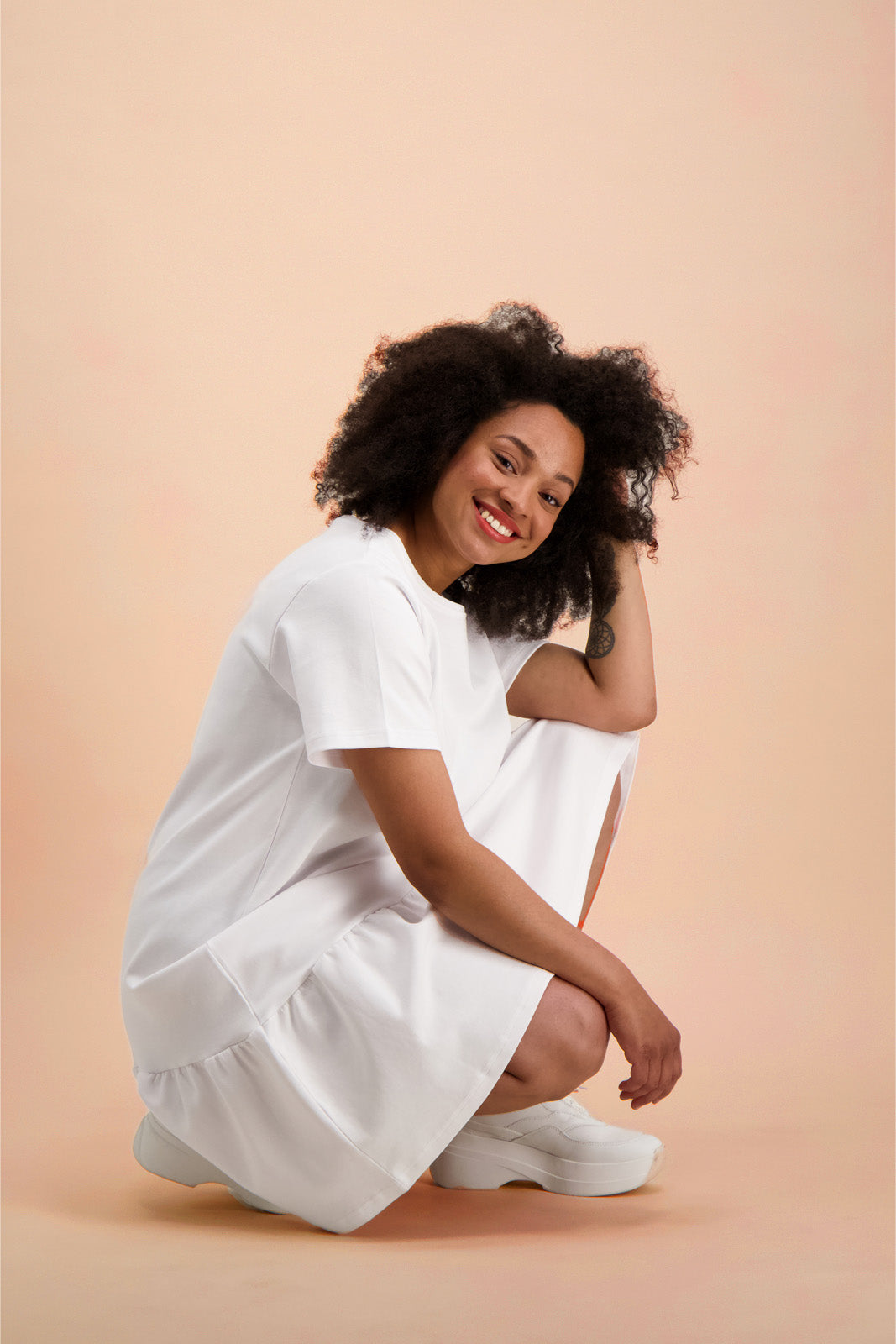 Das Skarppi Ruffle T-shirt Dress wird aus hochwertigem, angenehm dickem und festem Baumwolljersey gefertigt. Es hat eine lockere Passform, etwas längere T-Shirt-Ärmel und wird am Saum von einer verspielten Rüsche geschmückt. Die Farbe ist ein warmer, heller Ton.