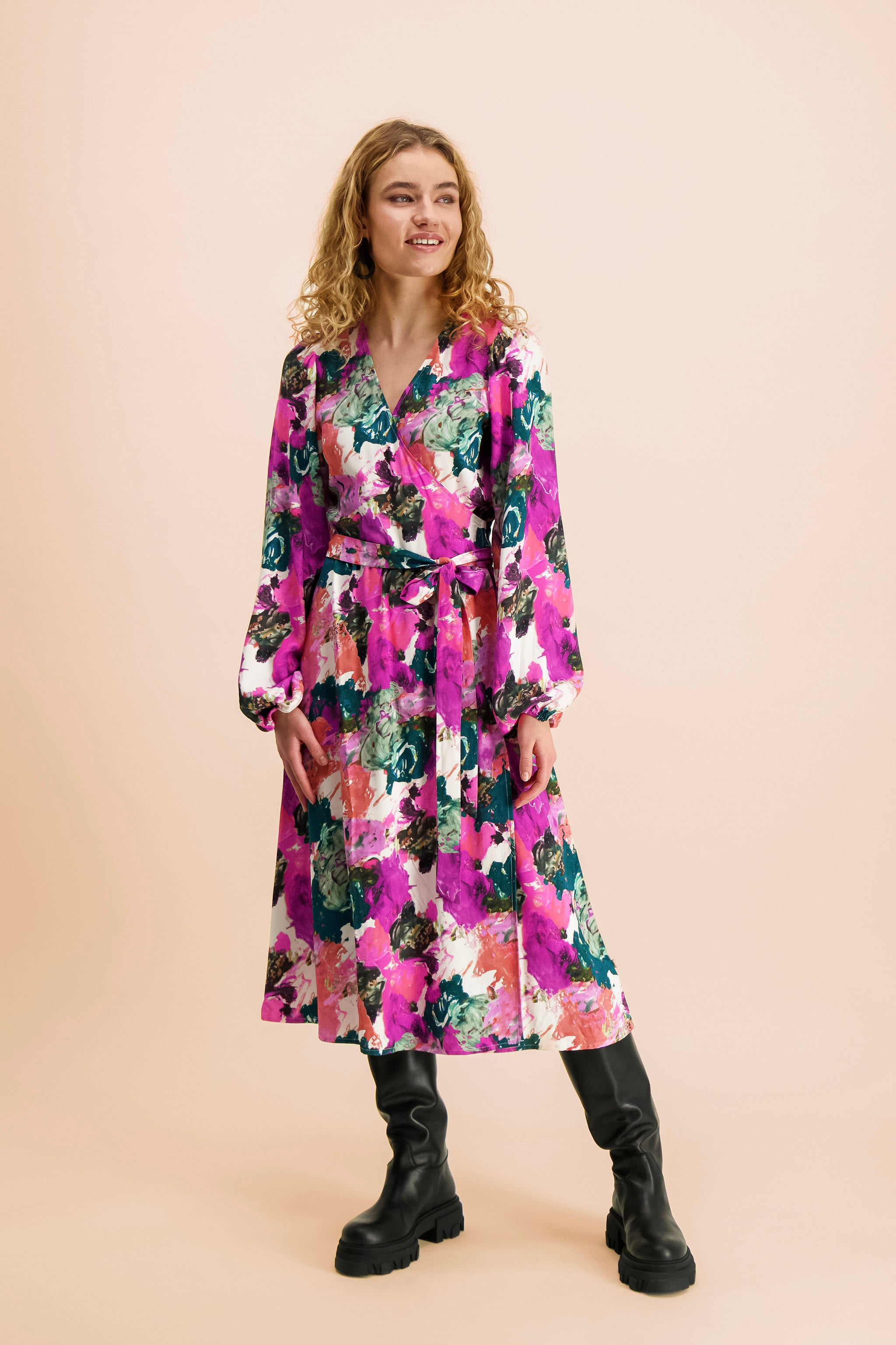Das stilvolle und feminine Wrap Dress ist ein Wickelkleid aus schön fallendem, gewebtem Kreppstoff. Das Kleid hat einen schmeichelhaften Wickelschnitt, und mit dem Taillenband lässt sich die Passform an der Taille individuell anpassen. Es hat weite, lange Ärmel, die an den Bündchen mit Gummizug gerafft sind, und Rüschen an den Schultern, die den Ärmeln ein schönes Volumen verleihen. Die Saumlänge reicht bis zur Wade. Das Muster Aquarelle ist ein kräftiges und auffälliges Aquarellkunstwerk.