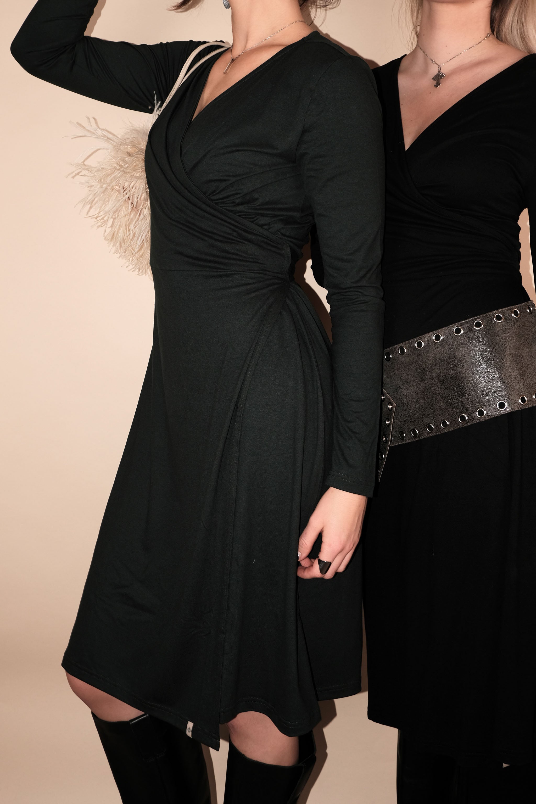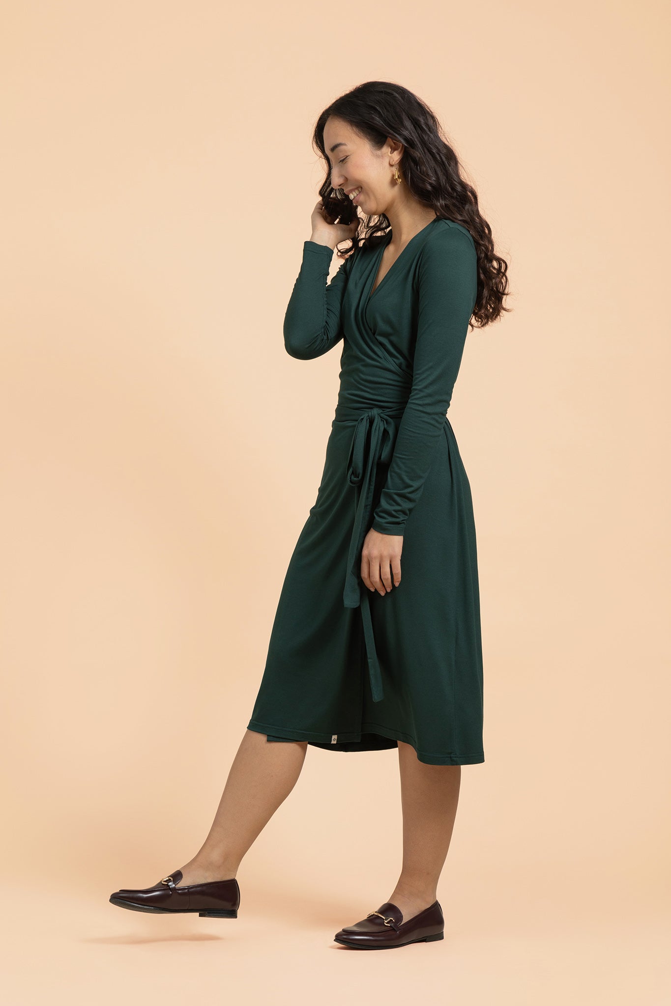 Das Soft Wrap Dress erstrahlt in einem dunkelgrünen Farbton – elegant, modern und nachhaltig zugleich.
