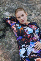 Das Midi Belted Dress aus weichem Bio-Baumwolljersey ist feminin geschnitten und liegt eng am Körper an. Die seitlichen Nähte des Kleides sind mit breiten Bändern versehen, die die Taille betonen und entweder vorne oder hinten gebunden werden können. Der Saum reicht etwa bis zur Wade, und an den Seitennähten befinden sich 20 cm lange Schlitze. Das Kleid hat lange Ärmel. Das Midi Belted Dress lässt sich sowohl für den Alltag als auch für besondere Anlässe leicht stylen. Das Trikotkleid ist im Black Anemone-Muster gehalten, bei dem große Aquarellblumen auf einem schwarzen Hintergrund blühen.