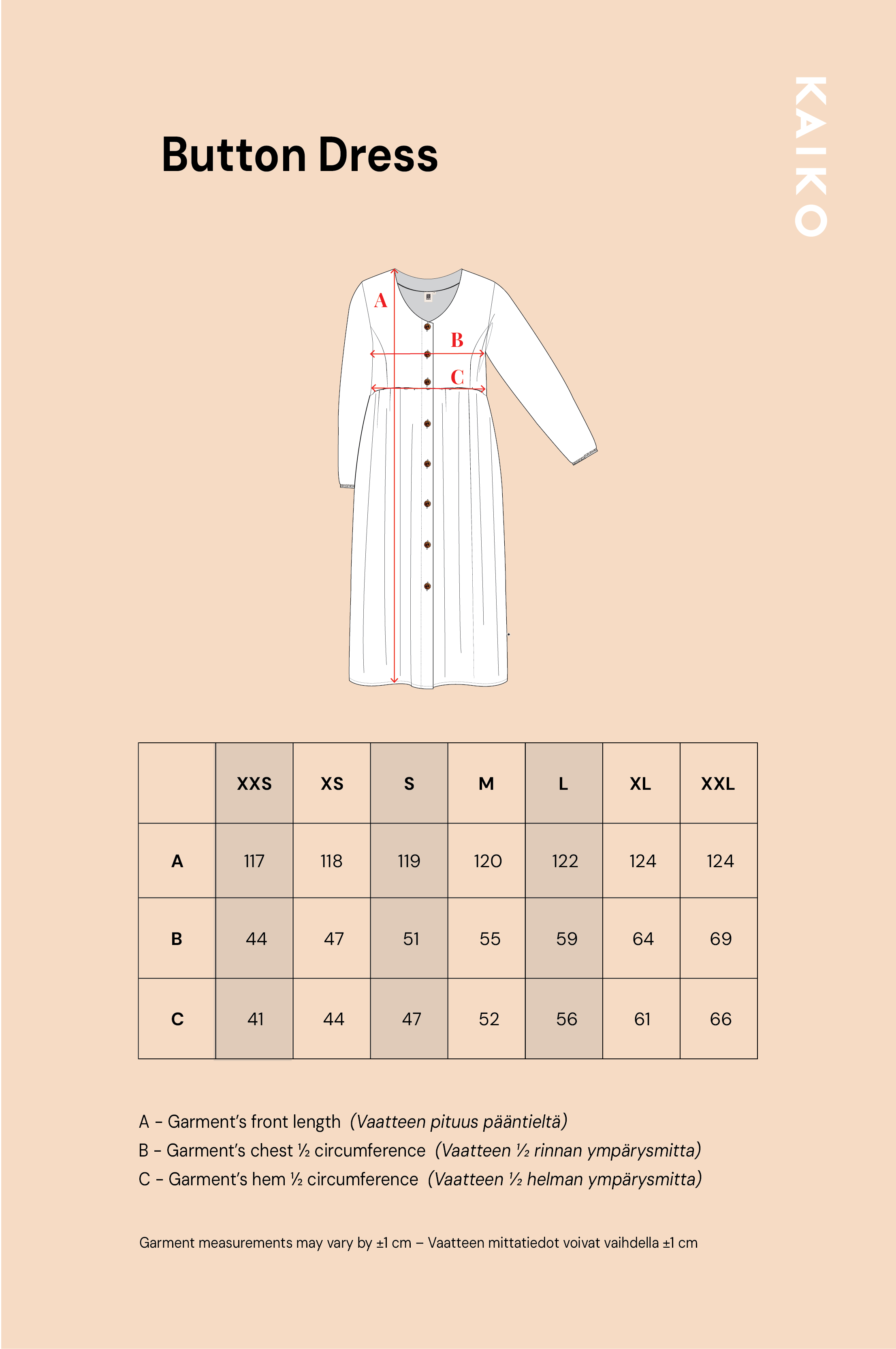 Nutzen Sie die Körpermaßtabelle und die Produktmaße (letztes Bild), um die Größe auszuwählen. Wir empfehlen Ihnen, eine Größe kleiner zu wählen, als Sie normalerweise wählen würden. Wenn Sie große Brüste haben, wählen Sie die Größe, die Sie normalerweise tragen. Lockere Passform. Der Brustumfang ist recht tailliert, die Taille locker. Länge unterhalb des Knies. Die Models sind 168 cm, 177 cm, 154 cm und 175 cm groß und tragen die Größen M, XS, XS und XS.