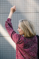Das Ruffle Sweatshirt Dress besteht aus wunderbar weichem Stretch-Sweatshirt in Bio-Baumwolle-Qualität. Das College-Kleid hat eine lockere Oversize-Passform, eine kurze Saumlänge, überschnittene Schulterlinie, lange Ärmel und eine verspielte Rüsche ziert den Saum. Das Muster heißt Wild Dots Burgundy, bei dem sandfarbene Punkte auf einem burgunderfarbenen Hintergrund tanzen.