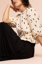 Die Cropped Blouse ist aus weichem und pflegeleichtem Bio-Baumwoll-Musselin gefertigt. Der Musselinstoff hat eine schöne, lebendige Textur und benötigt keinerlei Bügeln. Die locker geschnittene Cropped Blouse verfügt über Puffärmel, die an den Bündchen mit einem Gummizug gerafft sind. An den Schultern sorgt eine Raffung für Volumen in den Ärmeln, die etwa bis zum Unterarm reichen. Der etwas kürzere Saum der Bluse ist mit einem Gummizug gerafft, der die Weite des Shirts zusammenzieht und eine schöne Silhouette formt. Im Nacken befindet sich ein kleiner Schlitz mit Knopfverschluss.