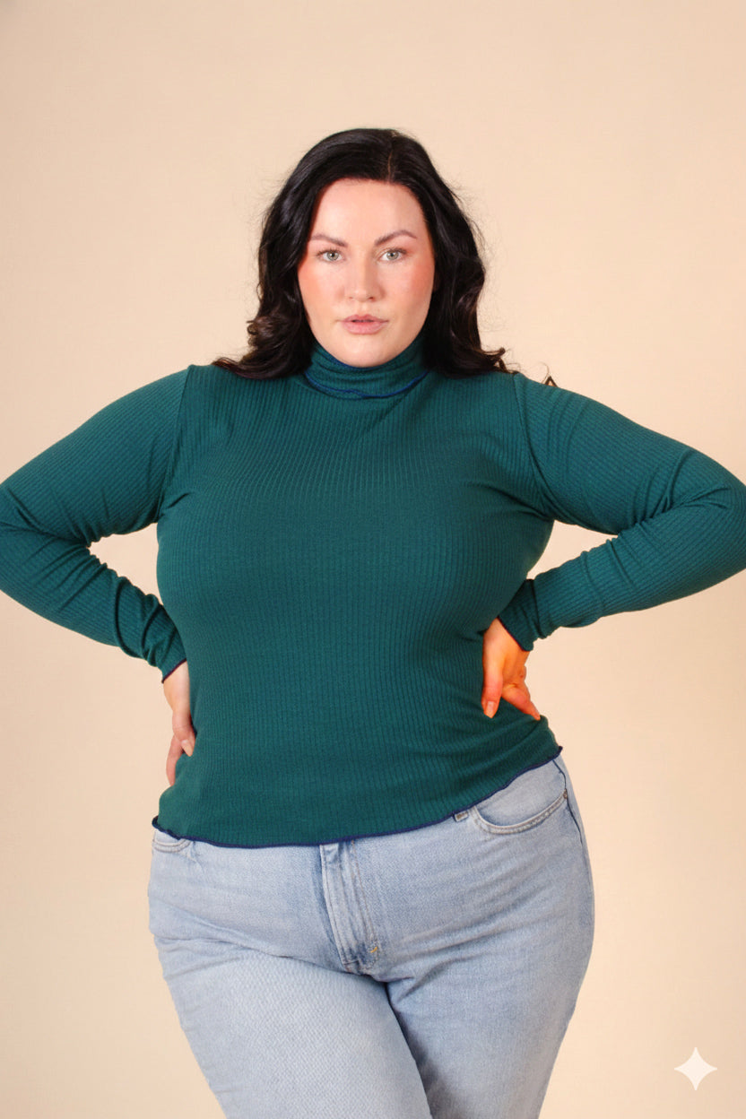 Dieses nachhaltig hergestellte Damenoberteil wurde für eine lange Lebensdauer entworfen. Das zeitlose Rollkragenshirt kannst du vielseitig kombinieren: Trage es solo, unter einer Strickjacke, mit einem lockeren Kleid oder zusammen mit einem Blazer für einen eleganten Bürolook. Die Farbe: Petrol.