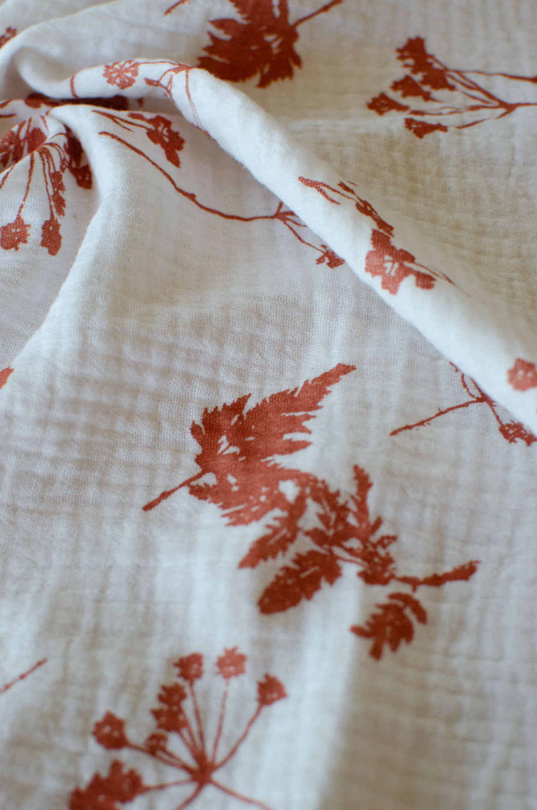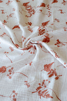 Dieser weiche Bio-Baumwollstoff ist leicht, einfach zu nähen und eignet sich sowohl für Produkte für Erwachsene und Kinder als auch für Wohnaccessoires! Der Stoff hat einen weißen Hintergrund mit einem orangefarbenen Muster.