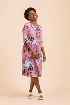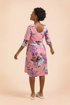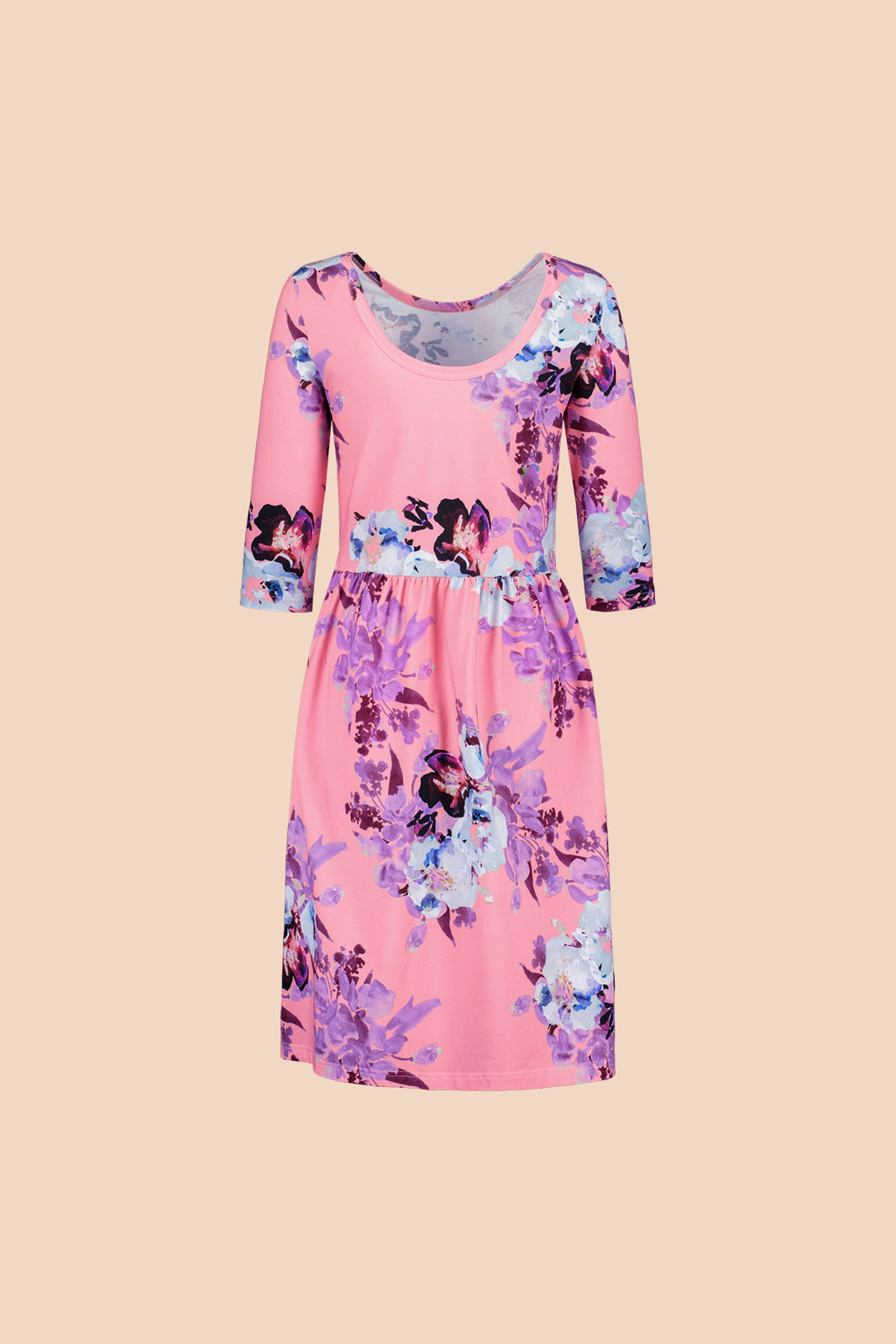 Das Kleid sitzt schön an Brust und Taille, während der weite Rock die klassische Silhouette perfekt abrundet. Es hat ¾-Ärmel, und der Rückenausschnitt ist elegant ausgeschnitten. Die Rocklänge reicht etwa bis zum Knie. Das Muster Garden Rose ziert das Kleid mit einem zarten rosa Hintergrund, der von großen Aquarellblumen geschmückt wird.