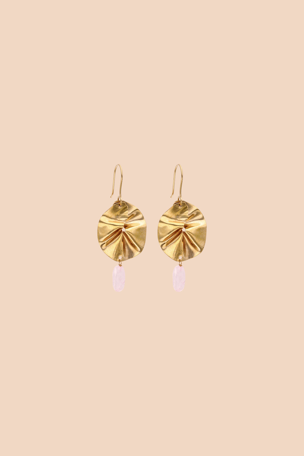 Die Merina-Ohrringe von Kaikon werden in Nepal handgefertigt und aus Messing geschmiedet. Der Stein des Schmucks ist Rosenquarz und seine Gesamtlänge beträgt ca. 6,5 cm. Die Ohrringhaken sind messing- und nickelfrei, können jedoch sehr empfindliche Haut reizen.