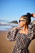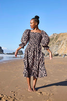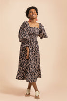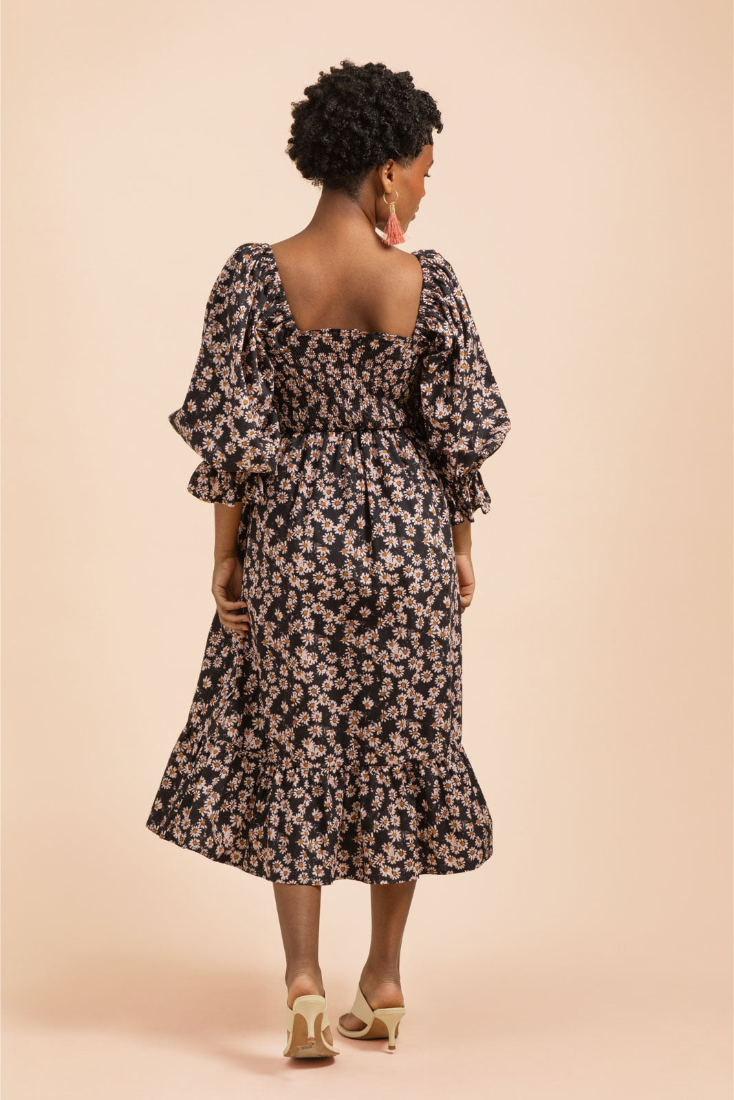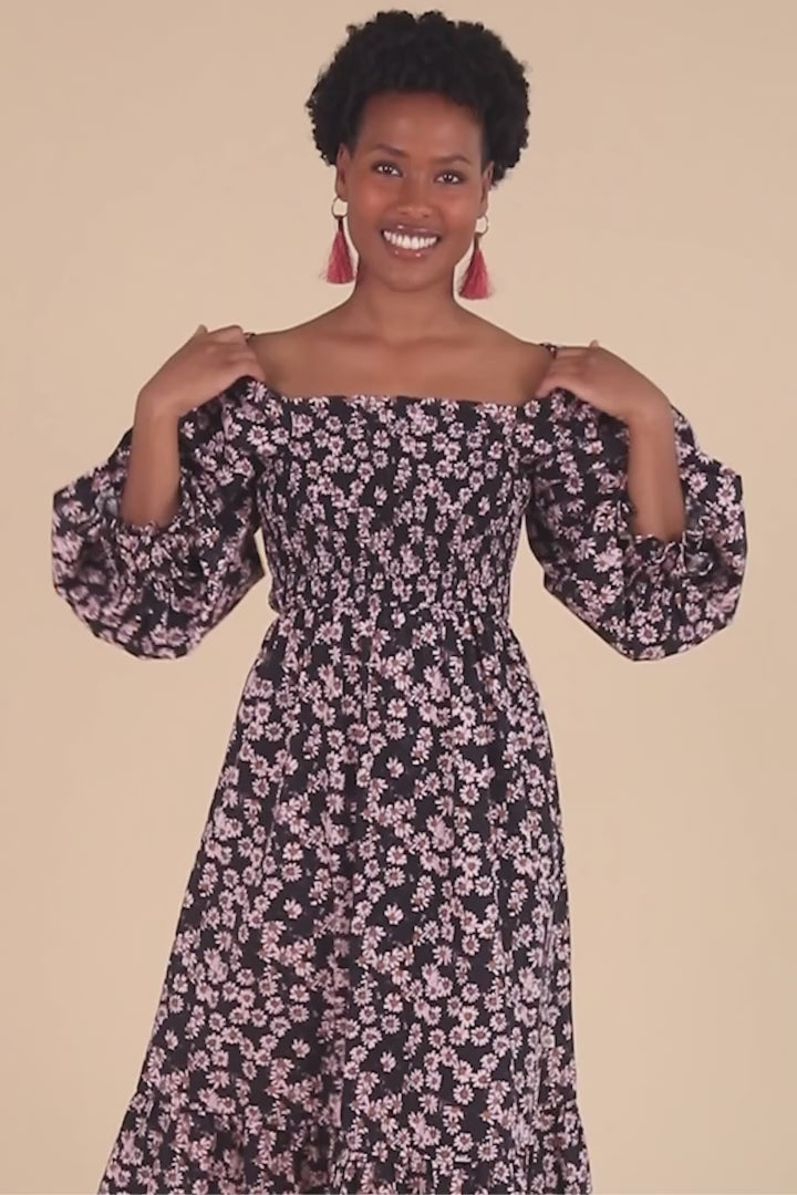 Die großen Puffärmel sind vielseitig gestaltet: Elastische Bänder an den Schultern halten die Ärmel sicher an Ort und Stelle, und bei Bedarf kannst du einen Off-Shoulder-Look kreieren, indem du die Ärmel von den Schultern herunterziehst. Die dreiviertellangen Ärmelabschlüsse sind mit hübschen Rüschen verziert, und der ausgestellte Midisaum wird ebenfalls mit charmanten Rüschen akzentuiert. Das zeitlose Muster Daisy zeigt Gänseblümchen, die sich auf einem schwarzen Hintergrund ranken.
